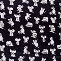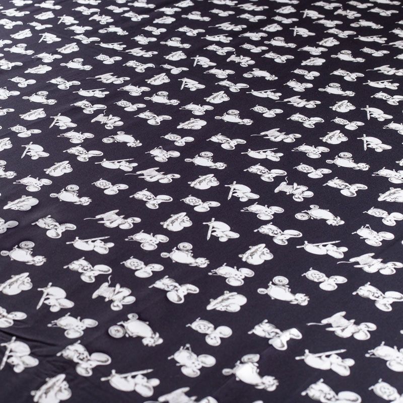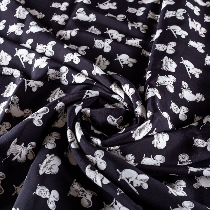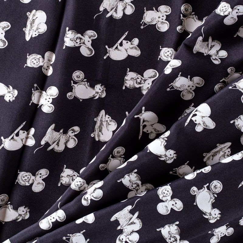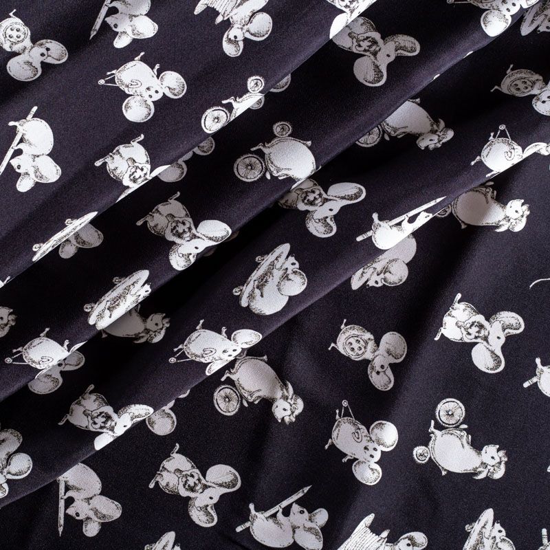 Итальянский матовый шелк черного цвета с узнаваемым игривым принтом от известного бренда. Ткань тонкая, не просвечивается, отлично драпируется, легкая и струящаяся, тянется за счет эластана в составе, лицевая сторона креповая, изнанка - атласная. Идеально подойдет для пошива платьев и сарафанов расклешенных моделей, с воланами, рюшами, летящих юбок, топов, блузки, рубашки, костюма в пижамном стиле.