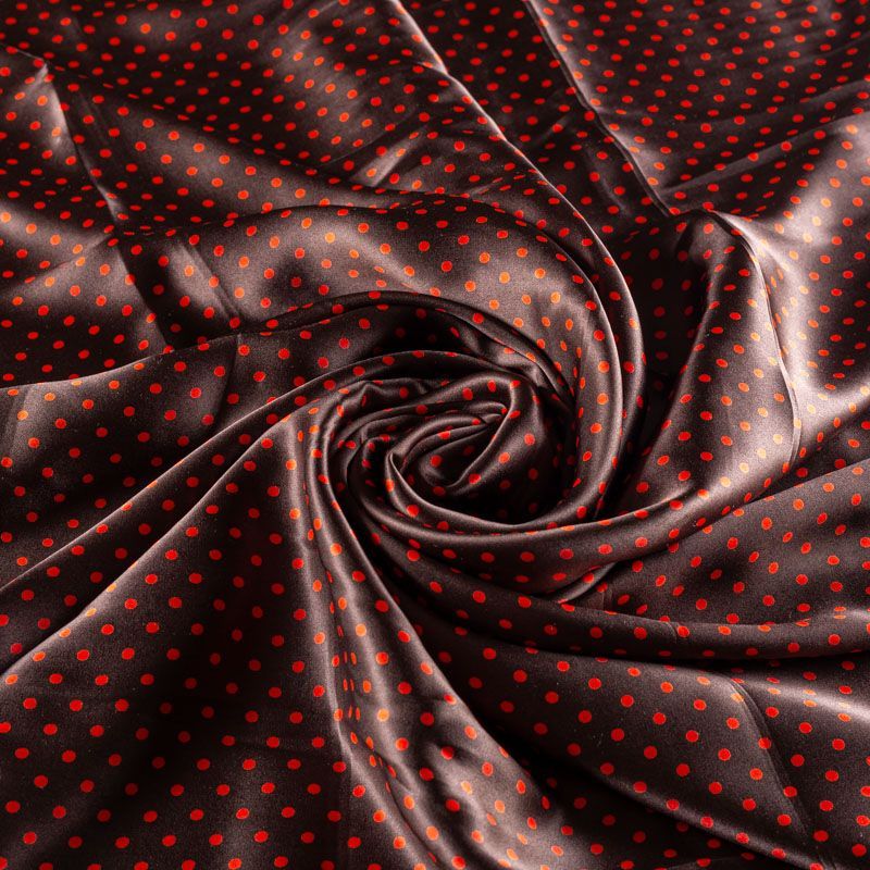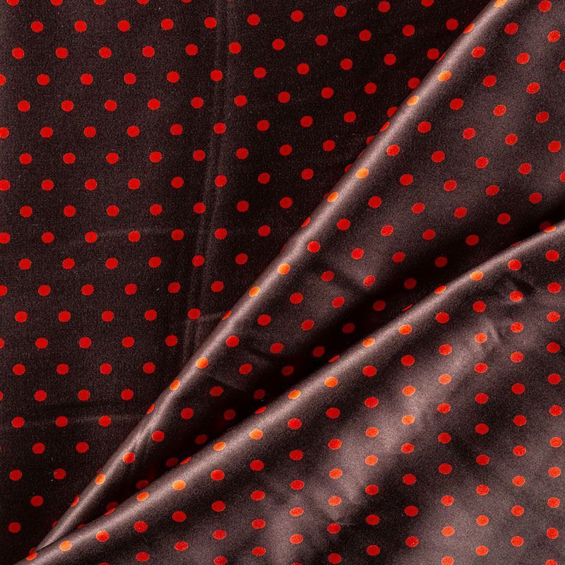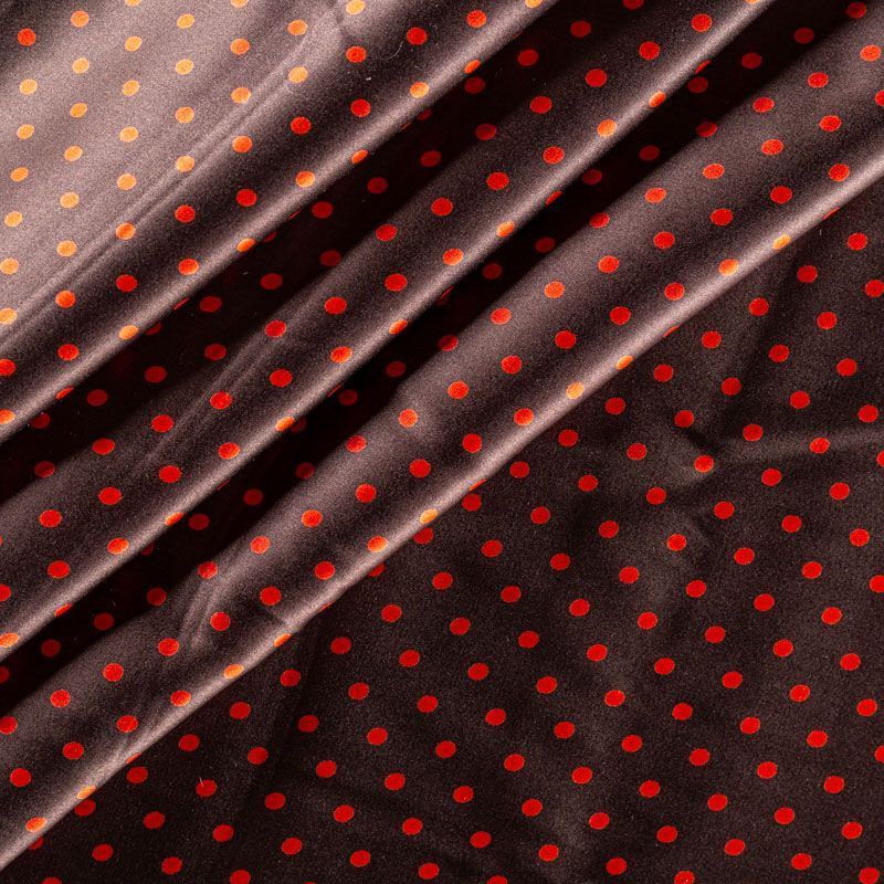Итальянский атласный шелк с классическим принтом "в горошек" оранжевого цвета на фоне оттенка молочного шоколада, тонкий, слегка прозрачный, отлично драпируется, легкий и струящийся. Идеально подойдет для пошива платьев и сарафанов расклешенных моделей, с воланами, летящих юбок, топов, блузки, костюма в пижамном стиле.