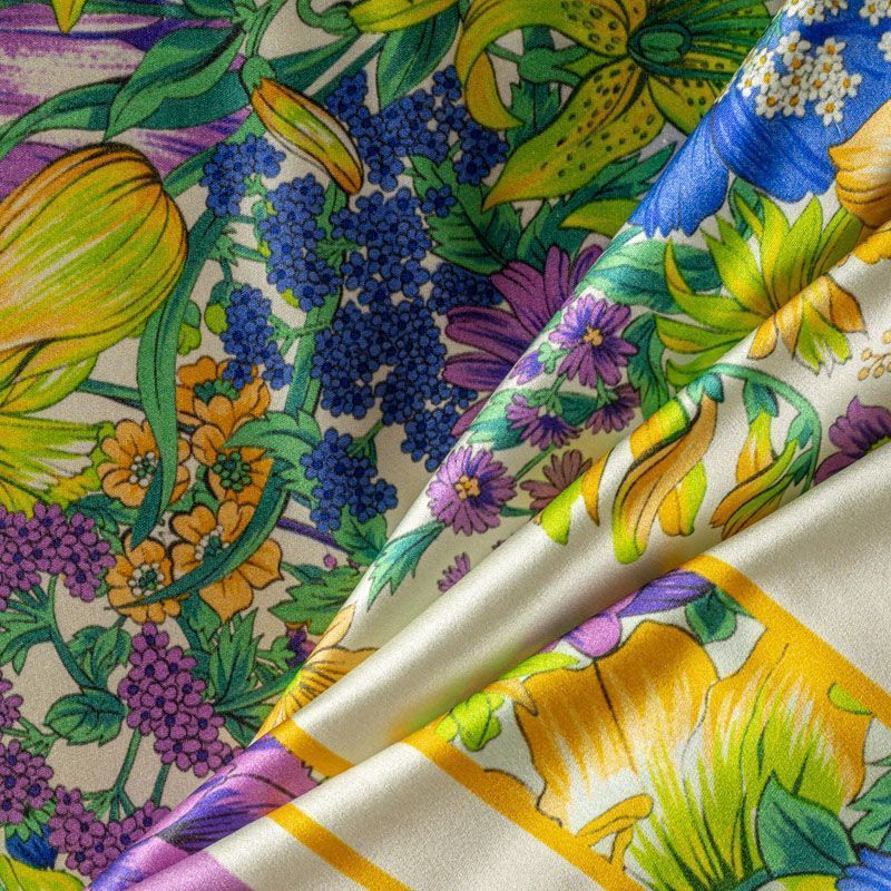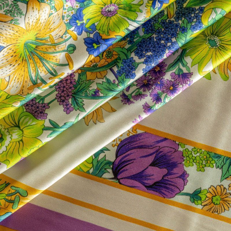 Итальянский атласный шелк с ярким цветным растительным принтом. Вдоль кромки оформлен цветными полосами в тон рисунку. Можно использовать в изделии по длине ткани и объемом. Ткань средней плотности, не просвечивает, струится, хорошо драпируется, не много тянется за счет эластана в составе. Поверхность глядкая, имеет благородный сатиновый блеск. Подойдет для смелых образов: летних платьев и сарафанов, как летящих фасонов, так и скроенных по косой, накидок, юбок, блузок, костюмов, широких брюк, домашней одежды.