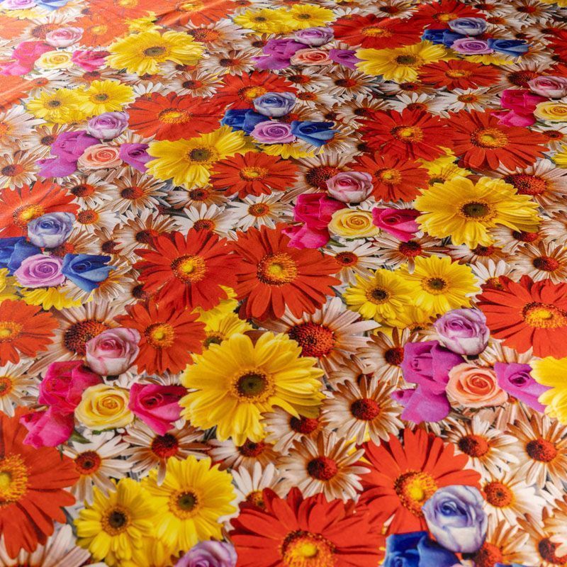 Итальянский шелк с летним ярким цветочным принтом на белом фоне, тонкий, слегка прозрачный, отлично драпируется, легкий и струящийся с атласной поверхностью. Идеально подойдет для пошива платьев и сарафанов расклешенных моделей, с воланами, рюшами, летящих юбок, топов, блузки, рубашки, костюма в пижамном стиле.