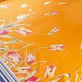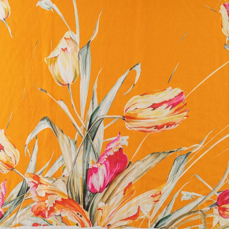 Итальянский шелк с матовой поверхностью, легкий, струящийся, хорошо драпируется. Яркий цветочный принт на оранжевом фоне дополнен по кромке полосками контрастного синего цвета. Ткань набирается объемом. Прекрасно подойдет для пошива летнего сарафана, платья, блузки, костюма в пижамном стиле, широких брюк или юбки.