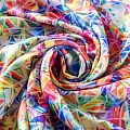 Плательно-блузочный штапель с добавлением шелка с ярким геометрическим принтом. Ткань очень мягкая, нежная, пластичная, шелковистая на ощупь, хорошо драпируется, практичная. Особенно актуальна летом, шелк-штапель очень легкий, обволакивающий прохладой. Идеален для пошива летней детской одежды, сарафанов, платьев, юбок, блузок, домашней одежды: халатов, ночной пижамы.