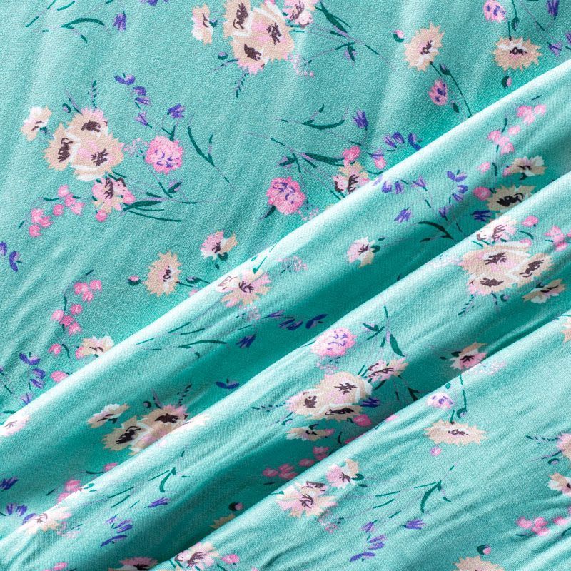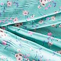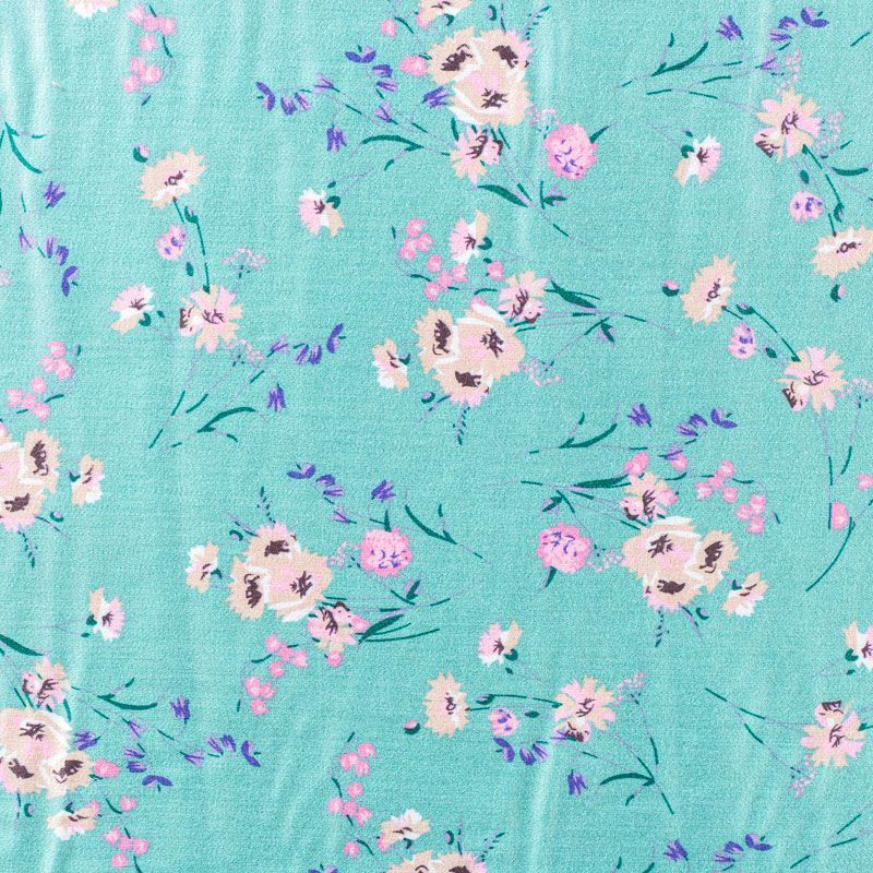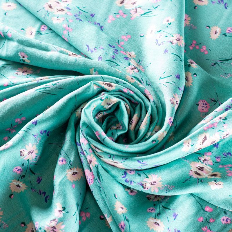Плательно-блузочный штапель с добавлением шелка с цветочным принтом в мятно-бирюзовых оттенках. Ткань очень мягкая, нежная, пластичная, шелковистая на ощупь, хорошо драпируется, практичная. Особенно актуальна летом, шелк-штапель очень легкий, обволакивающий прохладой. Идеален для пошива летней детской одежды, сарафанов, платьев, юбок, блузок, домашней одежды: халатов, ночной пижамы.