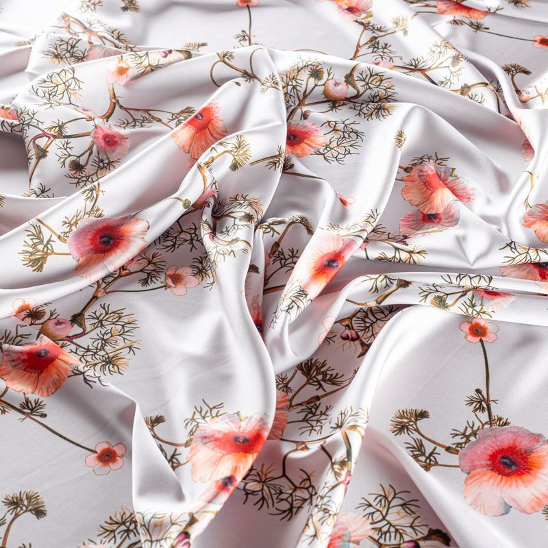 Тонкая, легкая, струящаяся ткань, не просвечивает, очень нежная и прятная к телу, обладает благородным атласным блеском, хорошо драпируется, не тянется. Идеально подойдет для пошива блузок, платьев и юбок, а также топов, платков, домашней одежды.