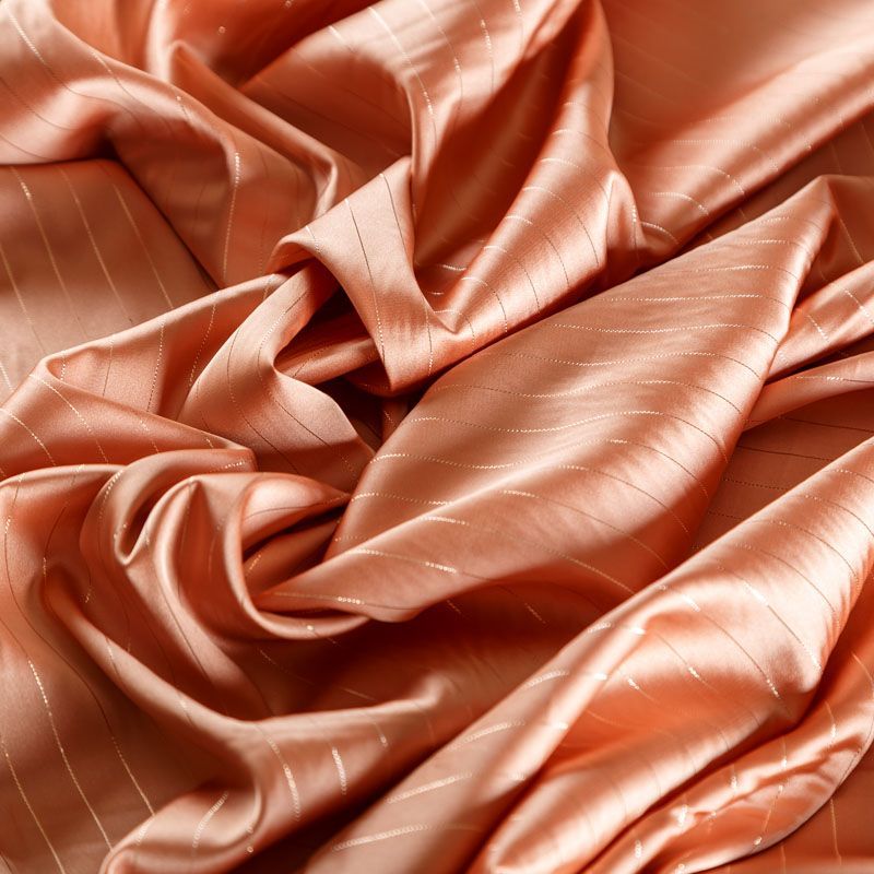 Тонкая, легкая, струящаяся ткань, декорированная тонкими вертикальными полосками люресовой нити, не просвечивает, очень нежная и прятная к телу, обладает благородным атласным блеском, хорошо драпируется, тянется за счет эластана в составе. Идеально подойдет для пошива блузок, платьев и юбок, а также топов, платков, домашней одежды.