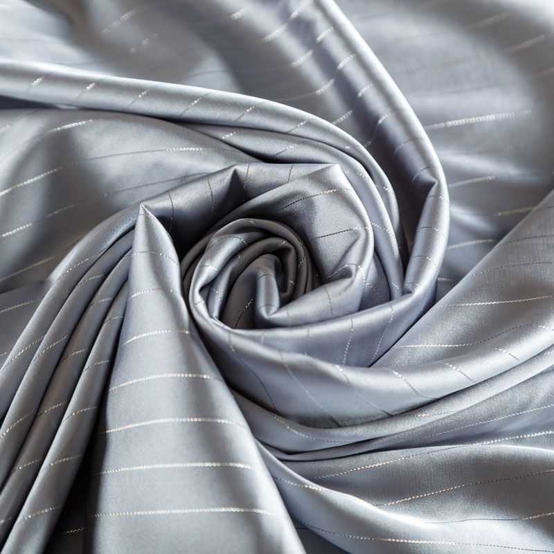 Тонкая, легкая, струящаяся ткань, декорированная тонкими вертикальными полосками люресовой нити, не просвечивает, очень нежная и прятная к телу, обладает благородным атласным блеском, хорошо драпируется, тянется за счет эластана в составе. Идеально подойдет для пошива блузок, платьев и юбок, а также топов, платков, домашней одежды.