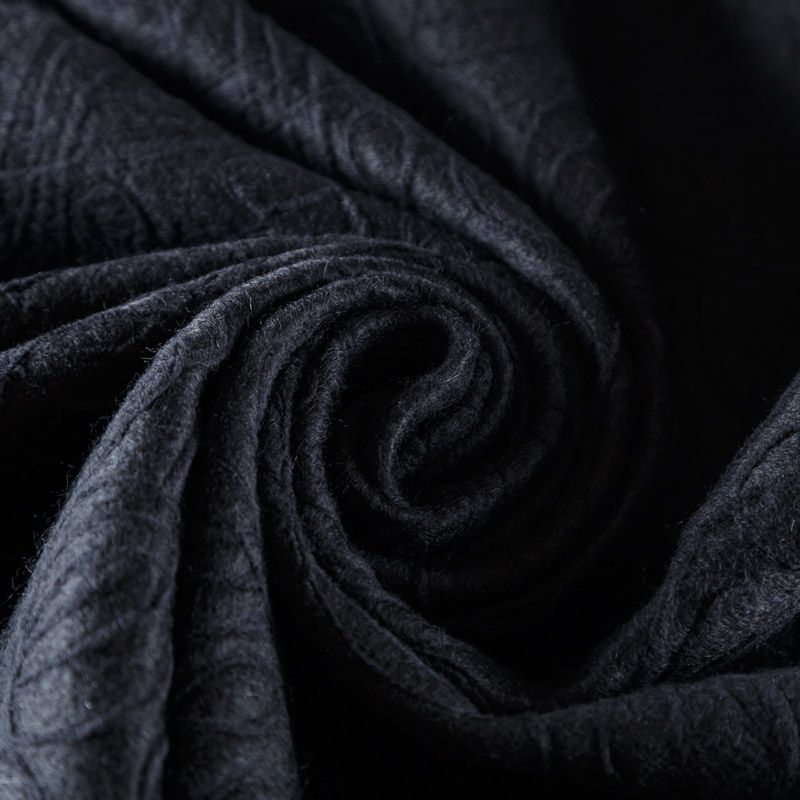 Итальянская фактурная шерсть в черном цвете. Ткань хорошо держит форму, приятная на ощупь, гибкая, средней толщины, при этом высокой плотности. Подойдет для пошива теплого костюма, юбки, пальто, куртки, жакета, парки, кейпа, жакета или пончо.