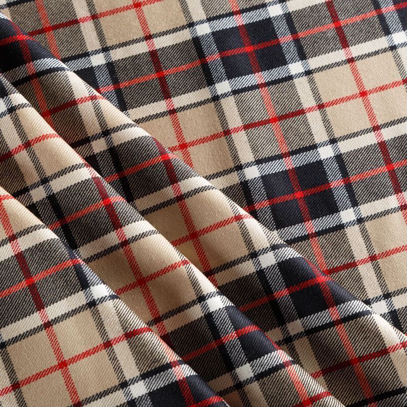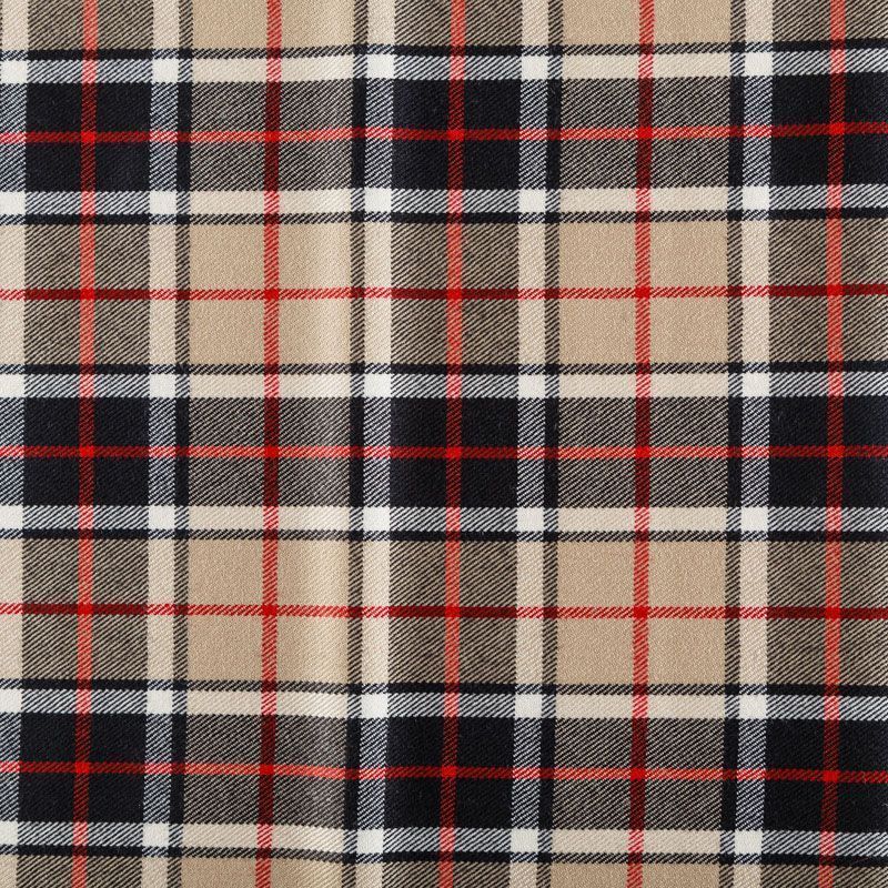 Костюмно-плательная итальянская шерсть средней плотности, мягкая, пластичная, хорошо драпируется и ниспадает. Очень теплая, уютная, не колется, в носке очень комфортная. Сочетание линий  черного, белого, красного и песочного цветов образуют сложную клетку тартан. Ткань прекрасно подойдет для пошива стильного платья прямого или расклешенного силуэта для сезона осень-зима, куртки-рубашки, юбки, костюмов, жакетов, брюк или шорт.