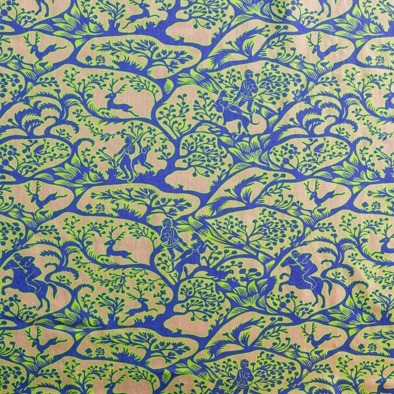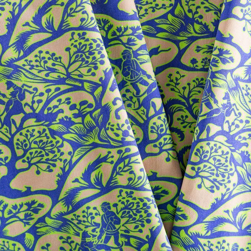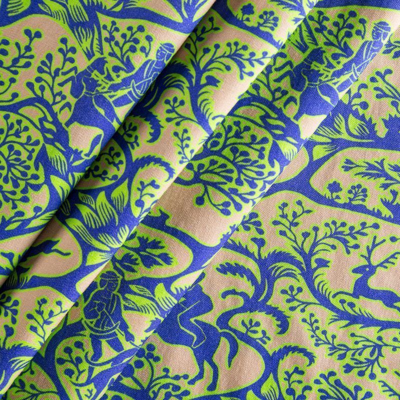 Итальянская плательная шерсть песочного оттенка со стилизованным принтом, описывающим сцену лесной охоты. Ткань тонкая, мягкая и пластичная, отлично драпируется. Поверхность матовая с твиловым плетением нитей. Прекрасно подойдет для создания осенних платьев, теплых туник, юбок, кофточек, жакетов, а также аксессуаров, таких как палантины, шарфы, платки.