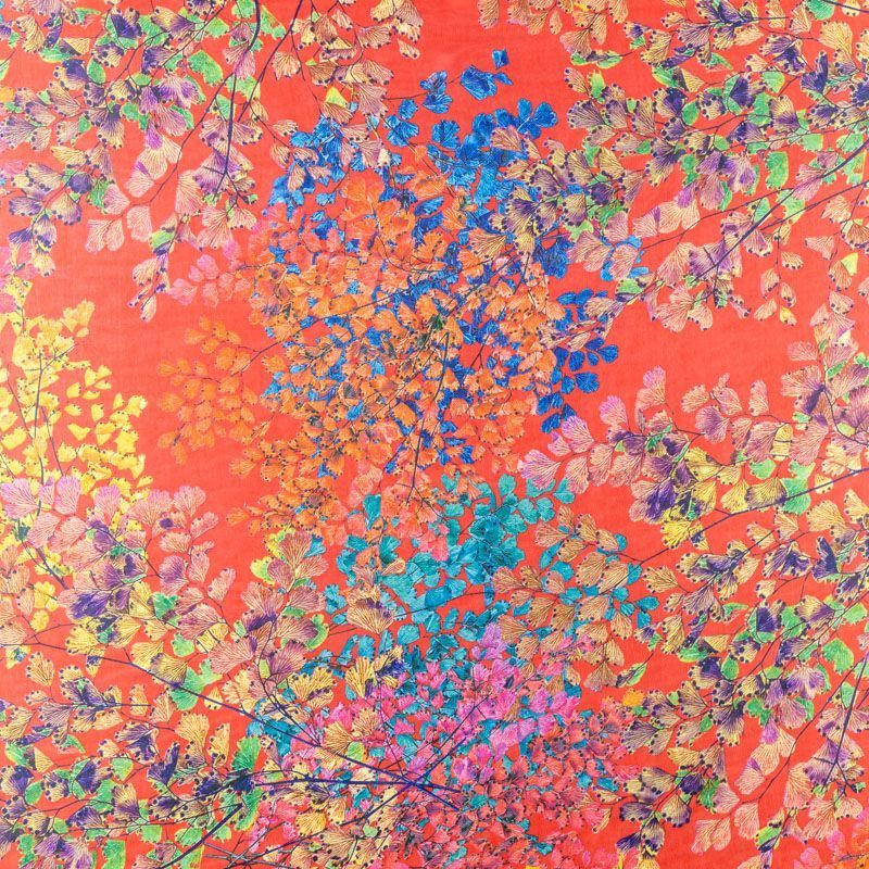 Шифон красного цвета с мелким растительным принтом в ярких оттенках. Струящийся, летящий, воздушный, полупрозрачный. На ощупь мягкий и приятный.Подойдет для пошива тончайших воздушных блуз, изумительных вечерних платьев и элегантных шарфов.