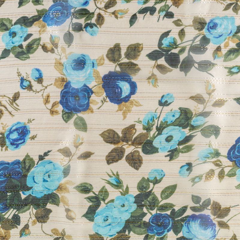 Шелковый шифон сливочного цвета с серебристым люрексом и цветочным принтом сине-зеленых оттенков. Струящийся, летящий, воздушный, полупрозрачный. На ощупь мягкий и приятный.Подойдет для пошива тончайших воздушных блуз, изумительных вечерних платьев и элегантных шарфов.