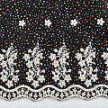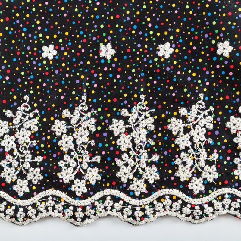 Мягкий и нежный хлопок черного цвета с мелким цветным принтом принтом украшен контрастной вышивкой. Узор выполнен путём машинной вышивки и расположен вдоль одной кромки, образуя фестон, поэтому набирается на изделие объемом. Ткань легкая, не сухая, хорошо драпируется и держит форму, имеет тенденцию к сминаемости, не просвечивает, не тянется, приятная на ощупь. Идеально подходит для создания летних платьев, сарафанов, юбок, блузок, топов, шорт.