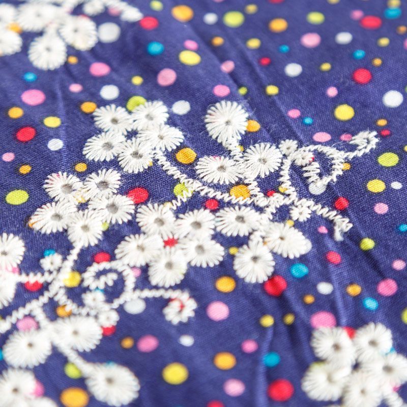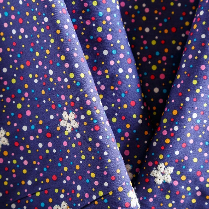 Мягкий и нежный хлопок синего цвета с мелким цветным принтом принтом украшен контрастной вышивкой.  Узор выполнен путём машинной вышивки и расположен вдоль одной кромки, образуя фестон, поэтому набирается на изделие объемом. Ткань легкая, не сухая, хорошо драпируется и держит форму, имеет тенденцию к сминаемости, не просвечивает, не тянется, приятная на ощупь. Идеально подходит для создания летних платьев, сарафанов, юбок, блузок, топов, шорт.