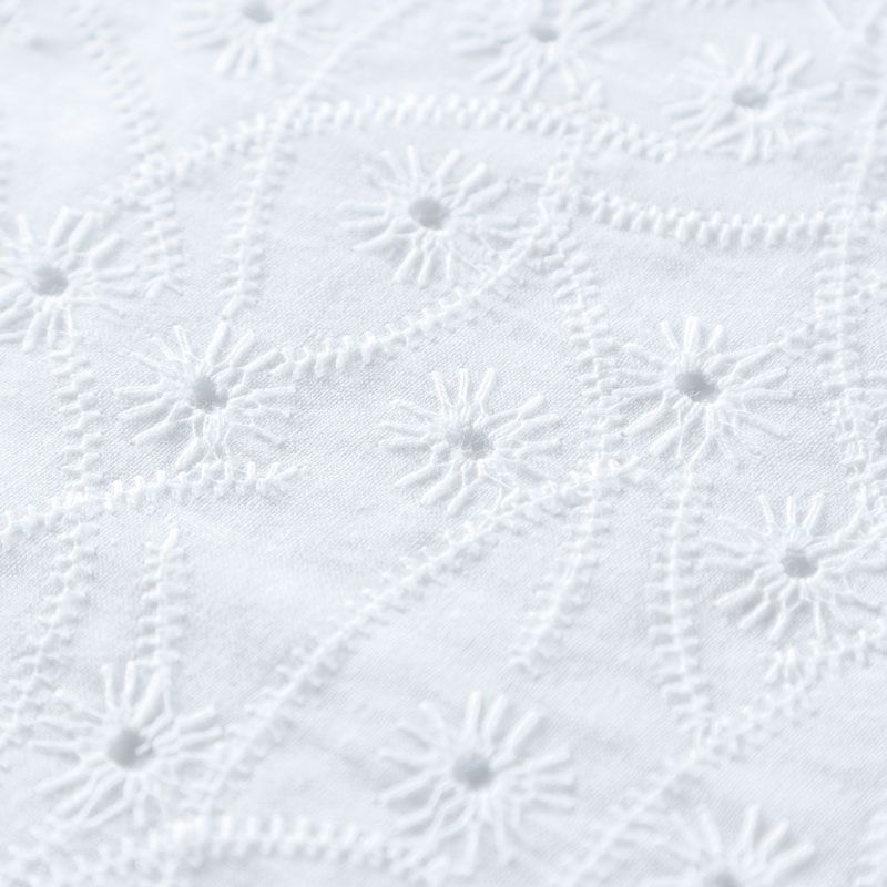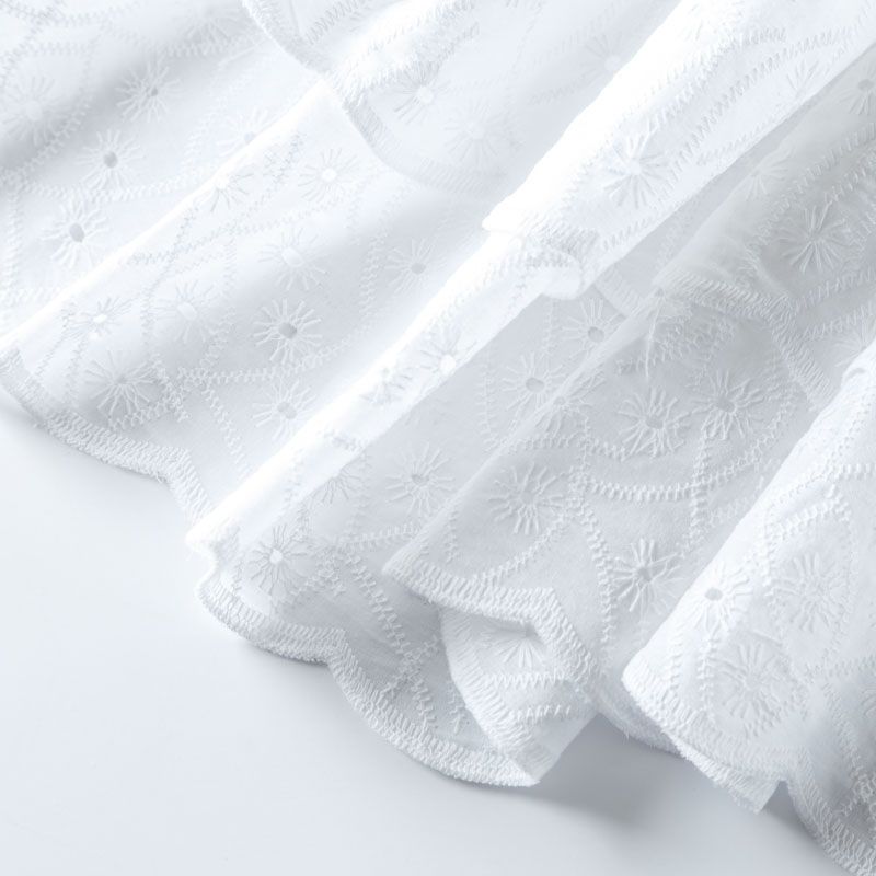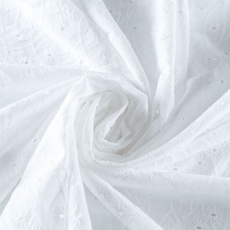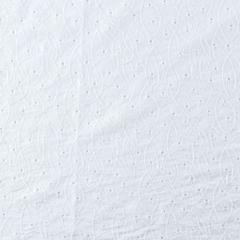 Итальянское шитье на белоснежной хлопковой основе с абстрактной, элегантной вышивкой,  расположеннной по всему полотну. Ткань мягкая, легкая, пластичная, приятная на ощупь, просвечивает, потребуется подклад. Обе кромки ткани оформлены фигурными фестонами. Идеально подойдет для пошива рубашки, блузы, топа в воланами, туники, платья, сарафана, юбки, шорт.