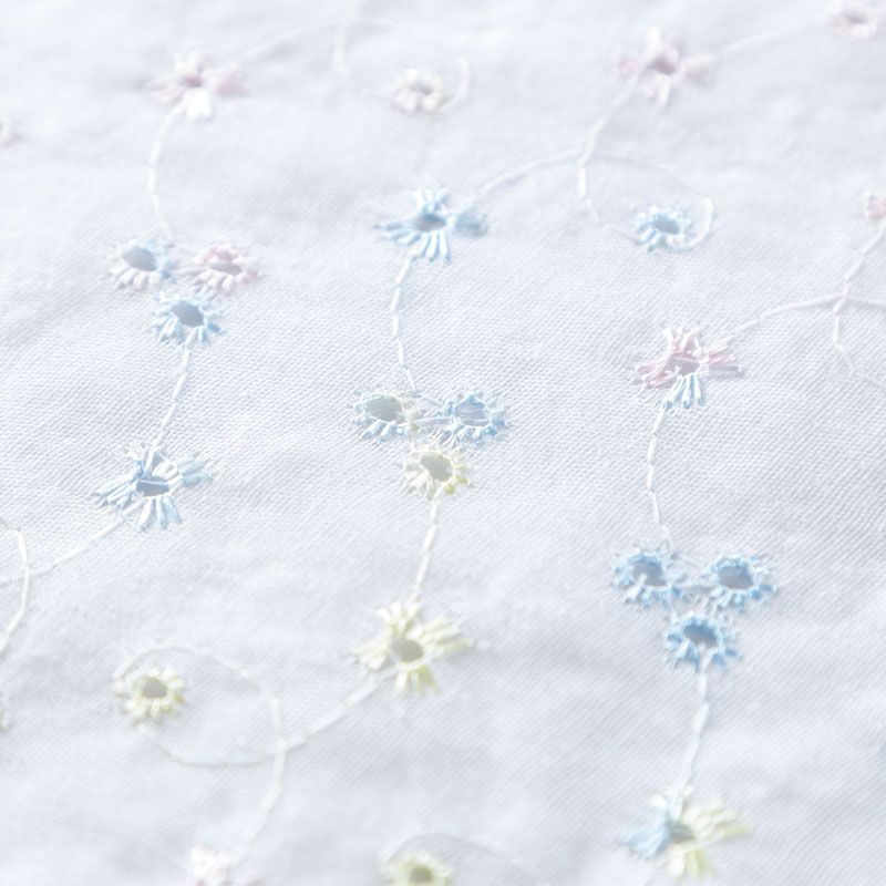 Мягкий и нежный хлопок белоснежного оттенка с вышивкой и перфорацией. Узор выполнен путём машинной вышивки разноцветными нитками и расположен по всему полотну. Фактура ткани однородная, имеет тенденцию к сминаемости, не тянется, приятная на ощупь. Может потребоваться подклад. Идеально подходит для создания летних платьев, сарафанов, юбок, блузок и топов.