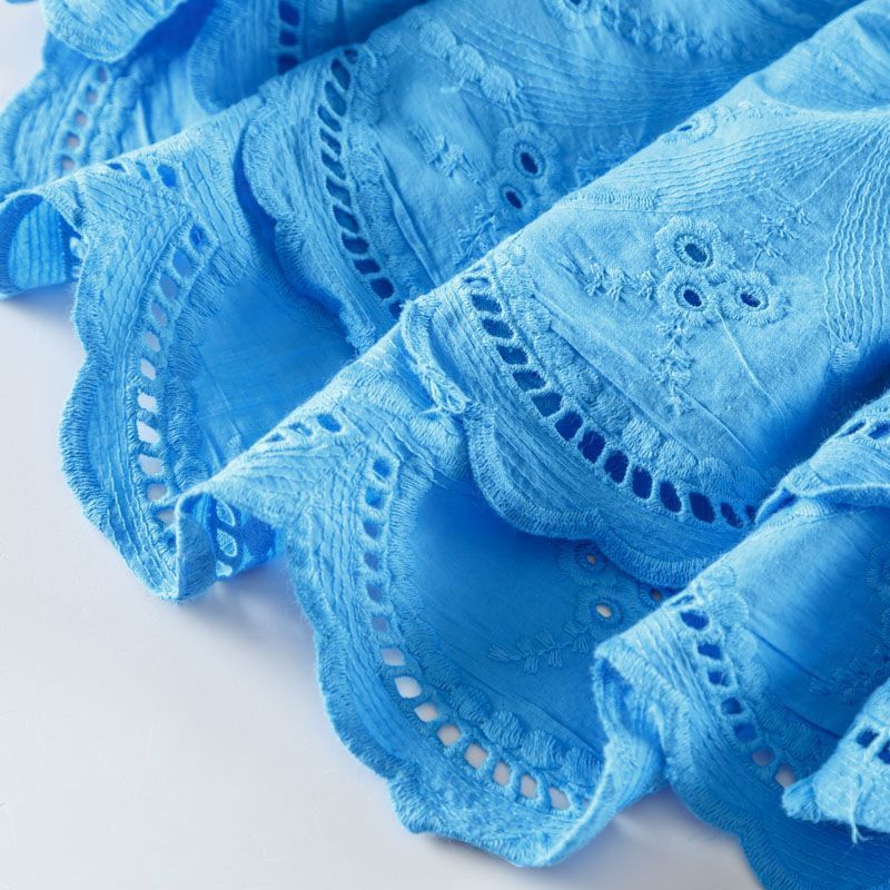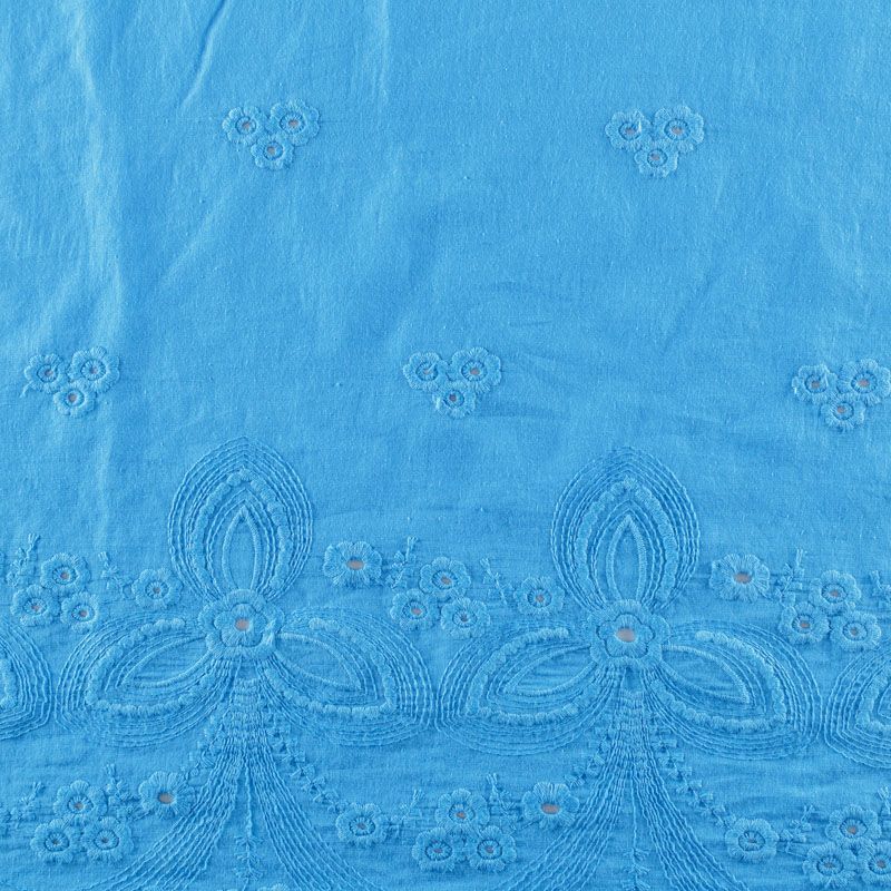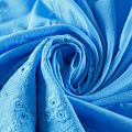 Итальянский мягкий и нежный хлопок насыщенного голубого оттенка с изящной вышивкой. Узор выполнен путём машинной ажурной вышивки нитками в цвет ткани и расположен вдоль кромки. Обе кромки ткани оформлены фигурными фестонами. Фактура ткани однородная, имеет тенденцию к сминаемости, немного просвечивает, не тянется, приятная на ощупь. Идеально подходит для создания летних платьев, сарафанов, юбок, блузок и топов.