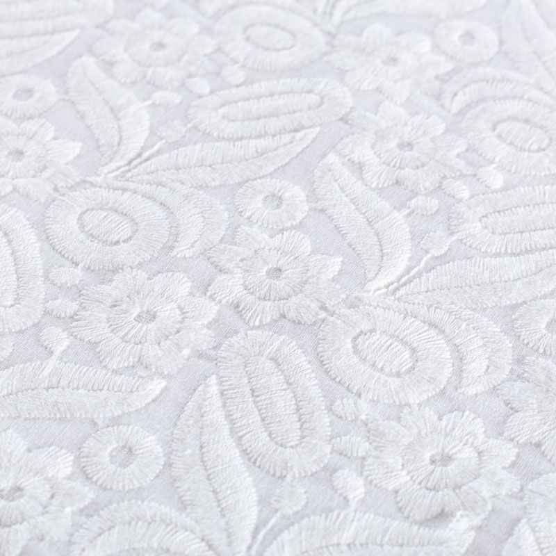 Итальянское шитье на белой хлопковой основе с плотной, не крупной, элегантной вышивкой,  расположеннной по всему полотну. Ткань мягкая, держит форму, приятная на ощупь, слегка просвечивает. Идеально подойдет для пошива рубашки, блузы, топа в воланами, туники, платья, сарафана, юбки, шорт.