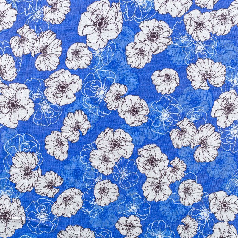 Плательно-блузочный штапель с черно-белым цветочным принтом на васильковом фоне. Ткань мягкая, тонкая, нежная, пластичная, приятная на ощупь, хорошо драпируется, практичная, поверхность слегка фактурная. Подойдет для пошива платья, топа, блузки, рубашки, юбки, летних брюк.