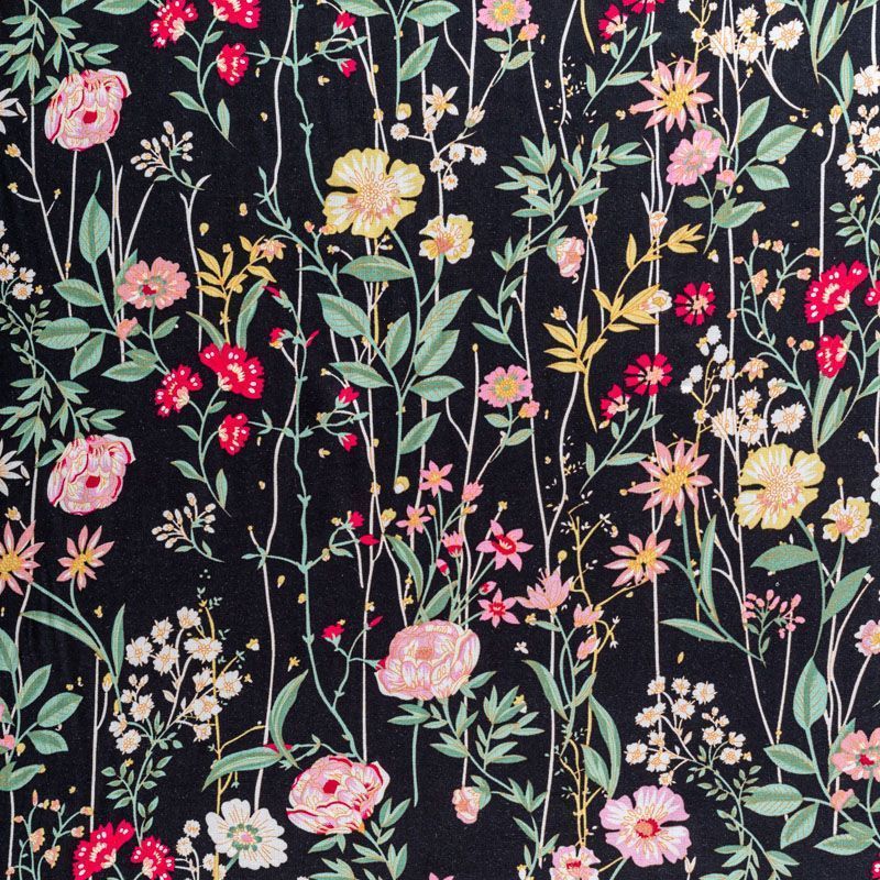 Плательно-блузочный штапель с элегантным цветочным принтом на черном фоне. Мягкий, тонкий, нежный, пластичный, приятный на ощупь, хорошо драпируется, практичный. Подойдет для пошива платья, топа, блузки, рубашки, юбки, летних брюк.