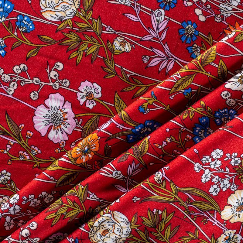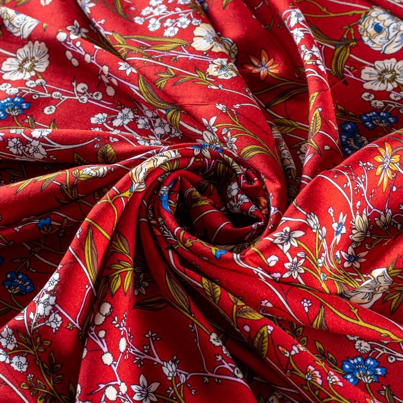 Плательно-блузочный штапель с элегантным цветочным принтом на красном фоне. Мягкий, тонкий, нежный, пластичный, приятный на ощупь, хорошо драпируется, практичный. Подойдет для пошива платья, топа, блузки, рубашки, юбки, летних брюк.