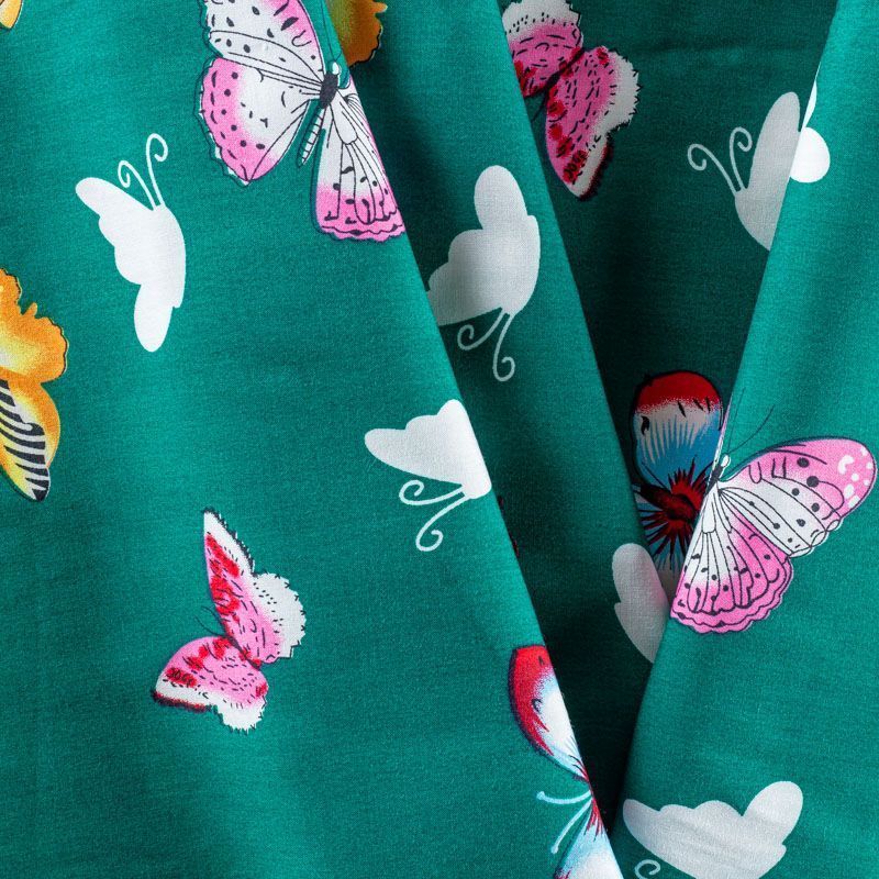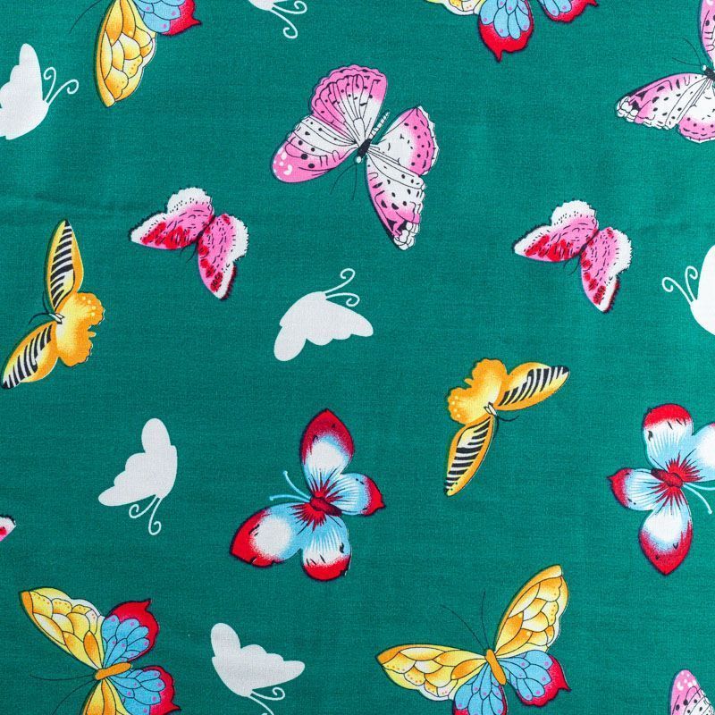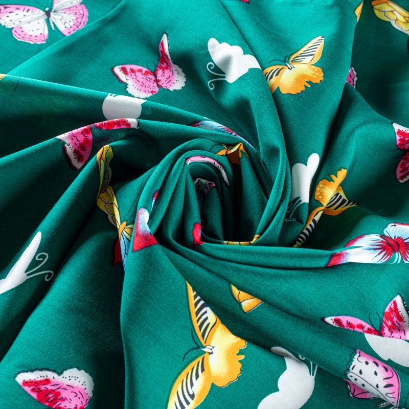 Плательно-блузочный штапель с романтичным принтом в виде цветных стилизованных бабочек на зеленом фоне. Мягкий, тонкий, нежный, пластичный, приятный на ощупь, хорошо драпируется, практичный. Подойдет для пошива платья, топа, блузки, рубашки, юбки, летних брюк.