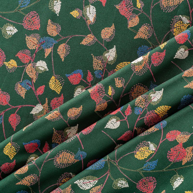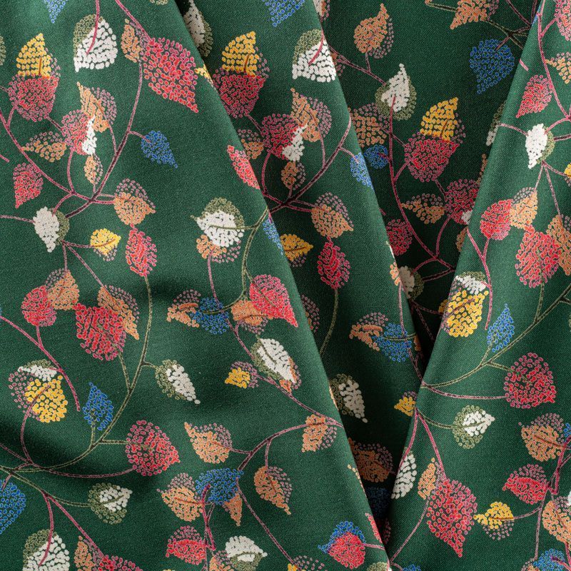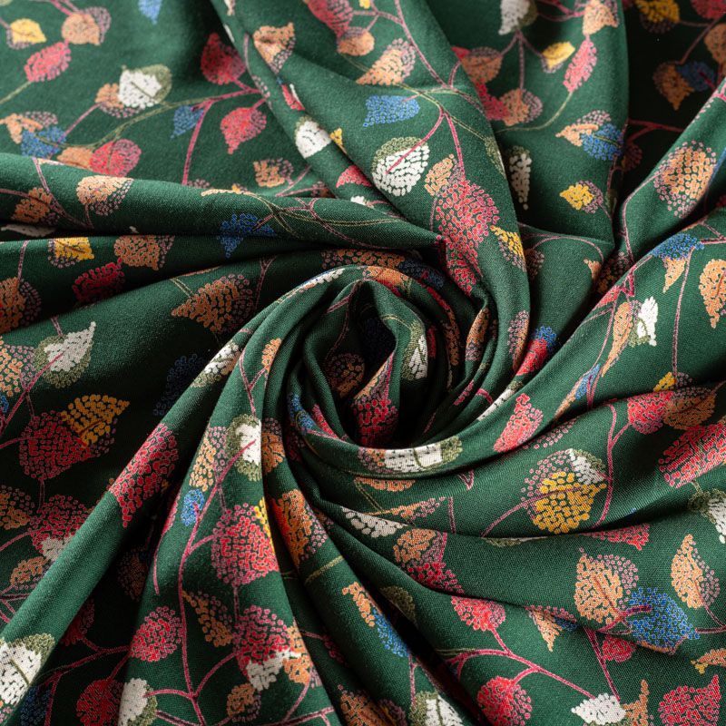 Плательно-блузочный штапель насыщенного зеленого оттенка с растительным принтом. Ткань мягкая, тонкая, нежная, пластичная, приятная на ощупь, хорошо драпируется, практичная, поверхность слегка фактурная. Подойдет для пошива платья, топа, блузки, рубашки, юбки, летних брюк.