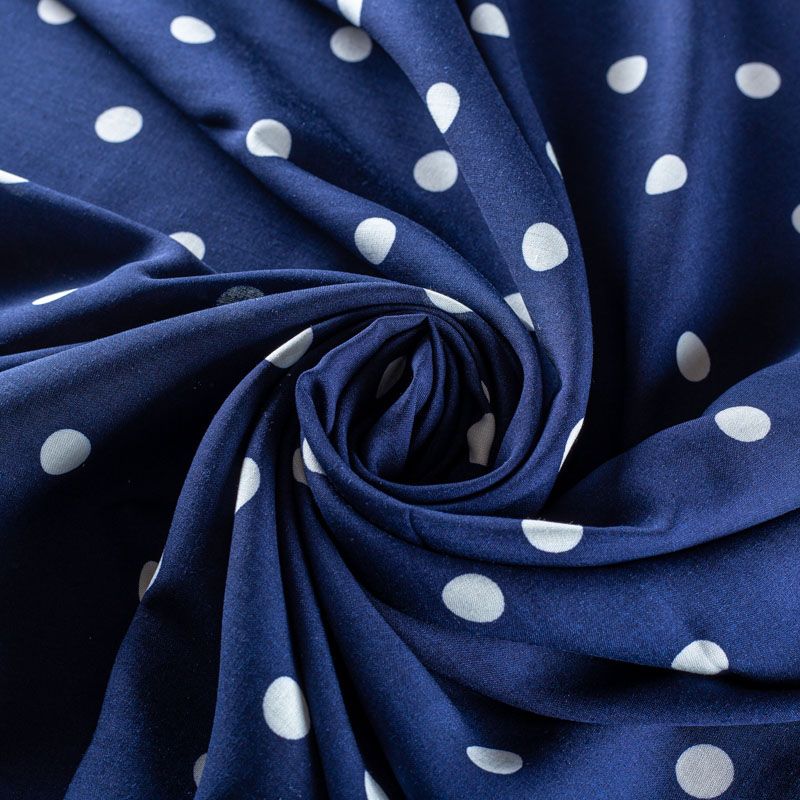 Плательно-блузочный штапель в белый горох на темно-синем фоне. Мягкий, тонкий, нежный, пластичный, приятный на ощупь, хорошо драпируется, практичный. Подойдет для пошива платья, топа, блузки, рубашки, юбки, летних брюк.