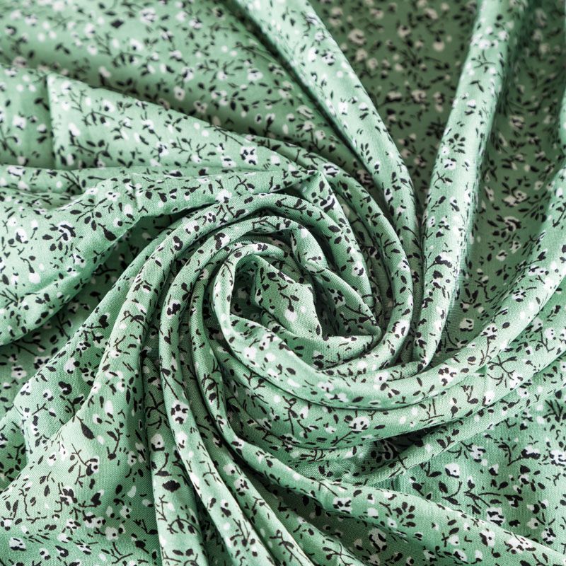 Плательно-блузочный штапель с мелким растительным принтом на мятно-зеленом фоне. Мягкий, тонкий, нежный, пластичный, приятный на ощупь, хорошо драпируется, практичный. Подойдет для пошива платья, топа, блузки, рубашки, юбки, летних брюк, комбинезона.
