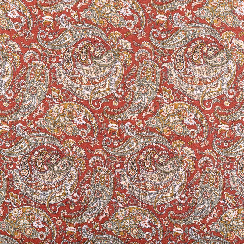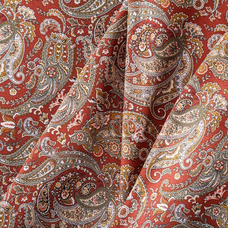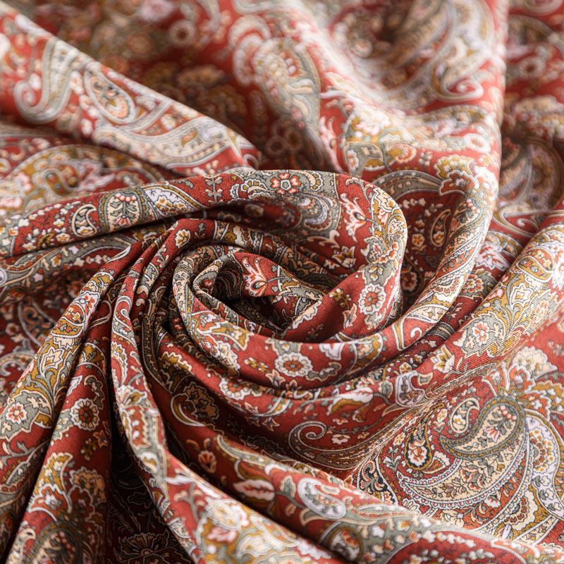 Плательно-блузочный штапель с богатым узором пейсли в серо-оливковых тонах на терракотовом фоне. Мягкий, тонкий, нежный, пластичный, приятный на ощупь, хорошо драпируется, практичный. Подойдет для пошива платья, топа, блузки, рубашки, юбки, летних брюк, комбинезона.