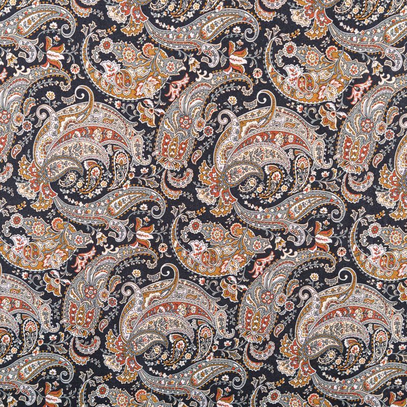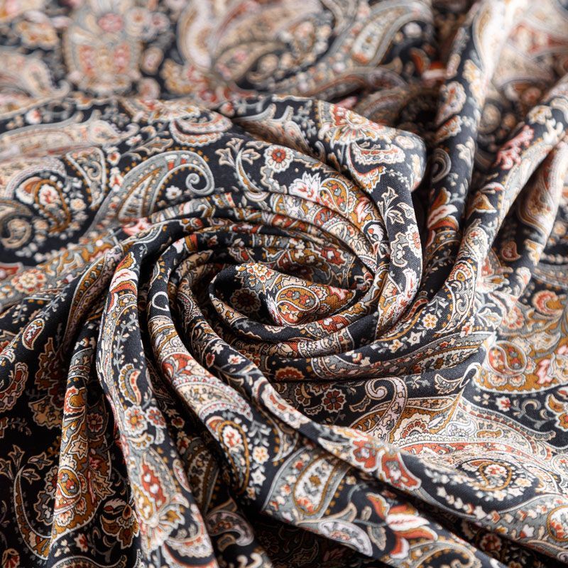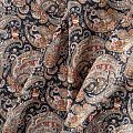Плательно-блузочный штапель с богатым узором пейсли в серо-коричневых тонах на черном фоне. Мягкий, тонкий, нежный, пластичный, приятный на ощупь, хорошо драпируется, практичный. Подойдет для пошива платья, топа, блузки, рубашки, юбки, летних брюк, комбинезона.
