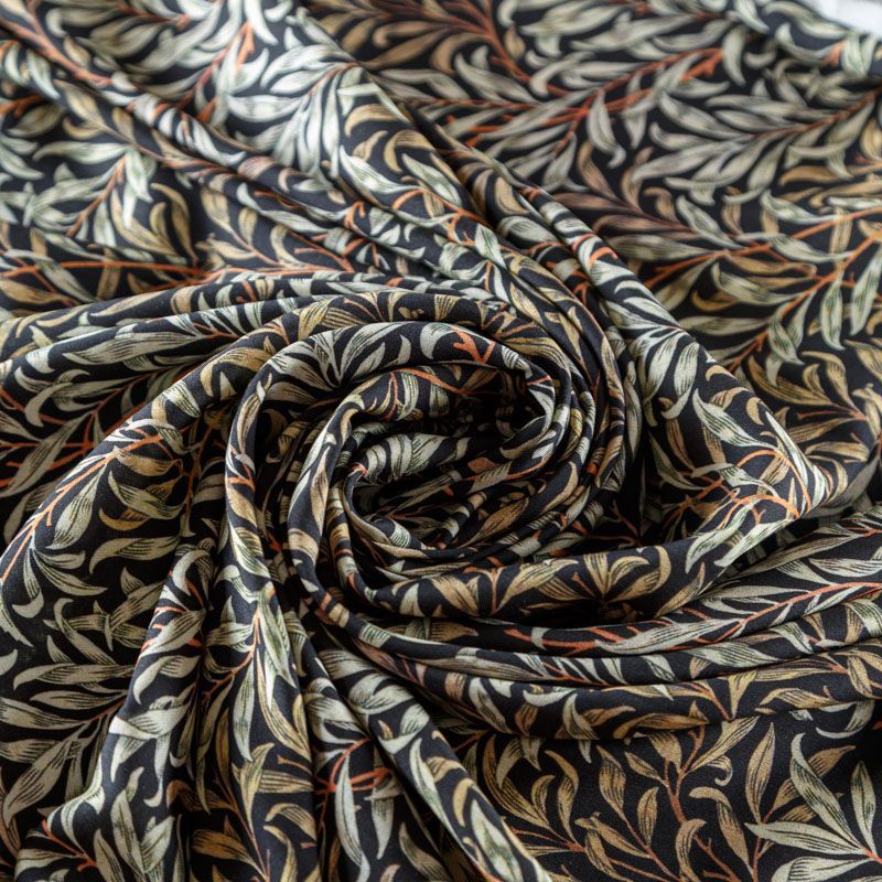 Итальянский плательно-блузочный штапель в черном цвете с растительным принтом. Ткань мягкая, тонкая, нежная и пластичная, приятная на ощупь, хорошо драпируется, практичная. Подойдет для пошива платья, топа, блузки, рубашки, юбки, летних брюк.