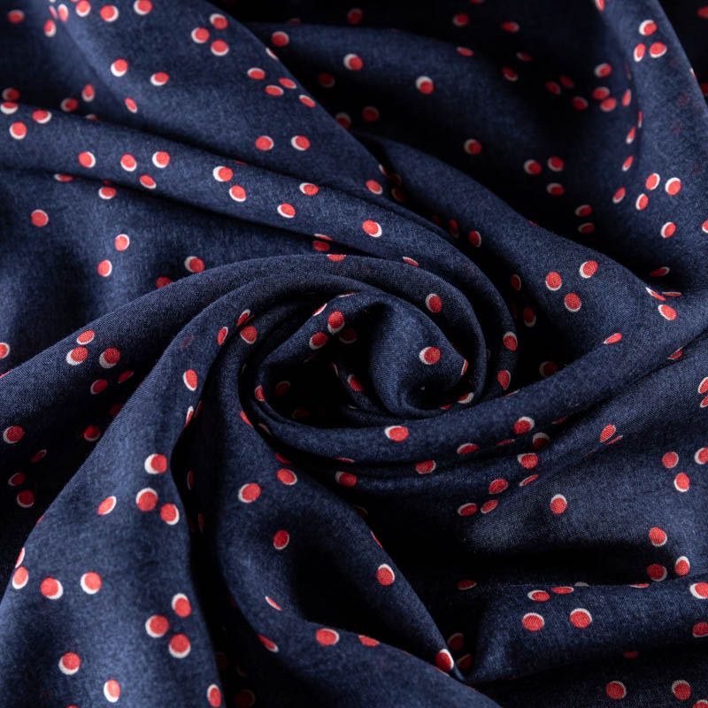 Ткань легкая и пластичная, отлично собирается в мягкие складки, красиво струится. Поверхность гладкая и шелковистая, без блеска. Не просвечивается. Подойдёт для платья, блузки, пляжной туники, топа, летних сарафанов, летящей юбки. Мелкий хаотичный горошек молочно-кораллового цвета освежается спокойный темно-синий фон вискозы.