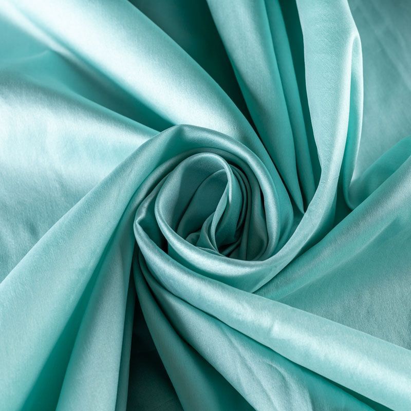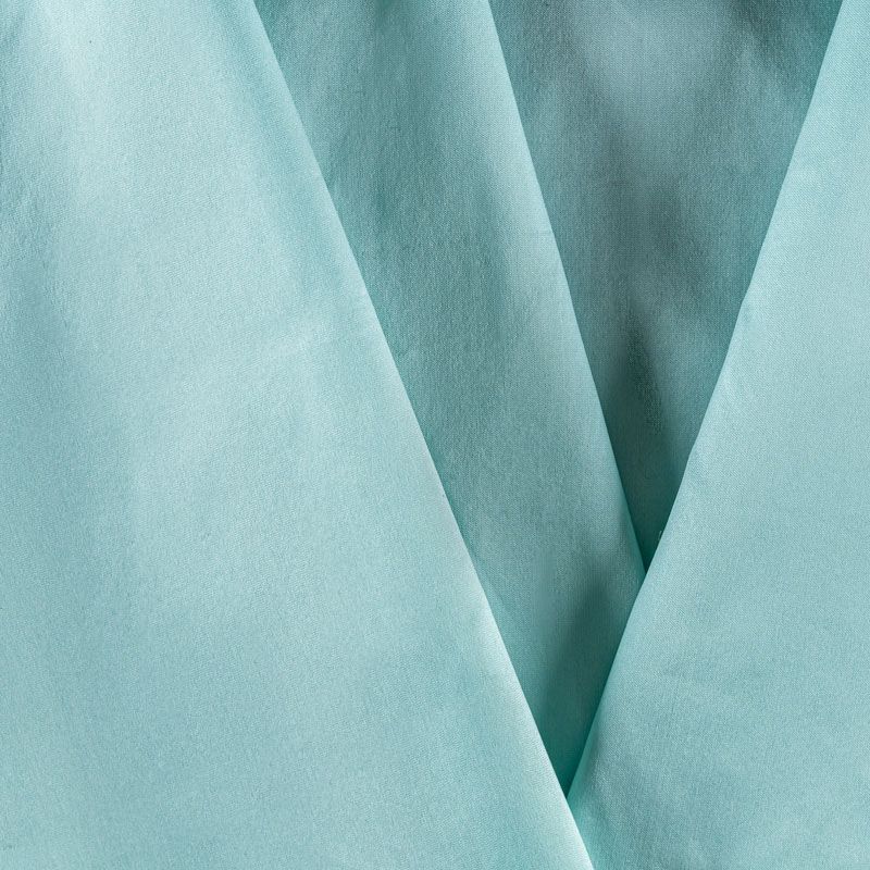 Шелковистая тафта светлого оттенка цвета тиффани. Поверность матовая, с благородным шелковым лоском. Полотно средней плотности, легкое, отлично держит форму, драпируется жесткими складками. Хорошо смотрится в платьях с пышными юбками и крупными драпировками, костюмах, корсетах для платья, вечерних и коктельных платьях.