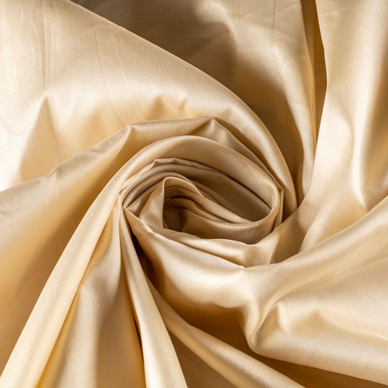 Шелковистая тафта сливочного оттенка. Поверность матовая, с благородным шелковым лоском. Полотно средней плотности, легкое, отлично держит форму, драпируется жесткими складками. Хорошо смотрится в платьях с пышными юбками и крупными драпировками, костюмах, корсетах для платья, вечерних и коктельных платьях.