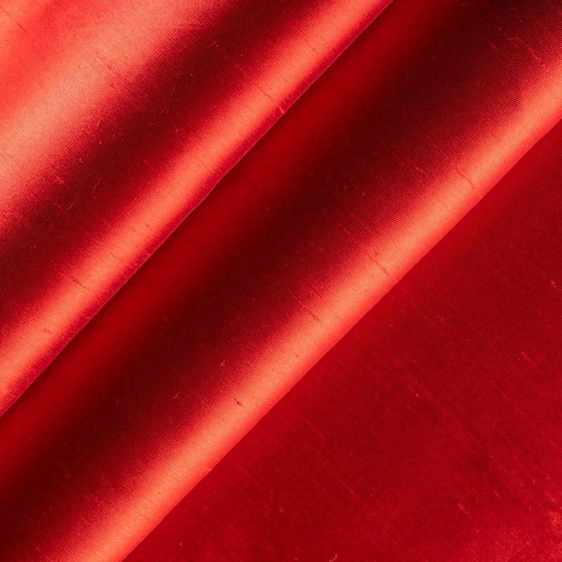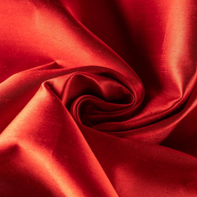Шелковая тафта насыщенного красно-оранжевого оттенка. Ткань тонкая, но плотная, отлично держит форму, драпируется красивыми жесткими складками и загибами. Поверхность слегка фактурная, с матовым блеском. На ощупь приятная, слегка шуршащая. Идеальна для пошива нарядных пышных платьев и юбок, вечерних костюмов, плащей и легких пальто.