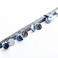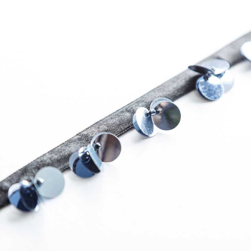 Тесьма представляет собой атласную ленту шириной 1 см, по краю которой пришиты глянцевые пайетки на ножке из бисера. Тесьма используется для отделки платьев, рубашек, манжет, вечерней и свадебной одежды, верхней одежды, обуви, сумок, украшений, а также для сценических костюмов.