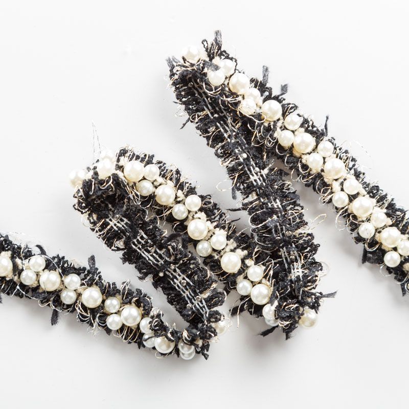 Тесьма декоративная выполнена из бархатистых нитей, прошита люрексом и украшена жемчужными бусинами. Бусины надежно закреплены на тесьме. Подойдет для отделки одежды из твида, букле в стиле Шанель.