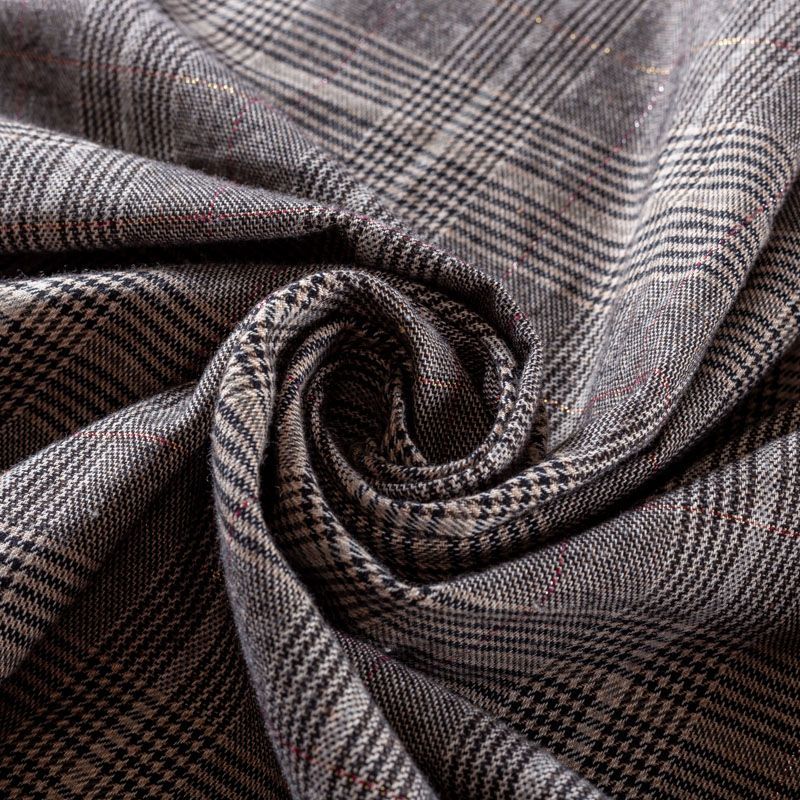Итальянская костюмная ткань в клетку гленчек, которая образуется жаккардовым переплетением серых, бежевых и черных нитей. Ткань очень мягкая, приятная на ощупь, пластичная, хорошо драпируется. Отлично подойдет на костюмы, юбки, брюки, платья, жакеты.