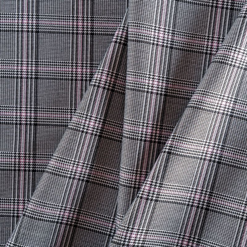 Ткань средней плотности, легкая и мягкая, приятная на ощупь, немного эластичная, хорошо драпируется и образует мягкие складки. Сочетание линий серого, белого и розового оттенков и принта "гусиная лапа" образует сложную красивую клетку. Монохромный строгий принт разбавляет еле уловимая элегантная тонкая полоска розового цвета. Ткань отлично подойдет на костюмы, юбки, брюки, платья, жакеты.