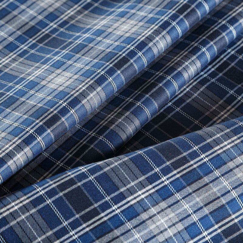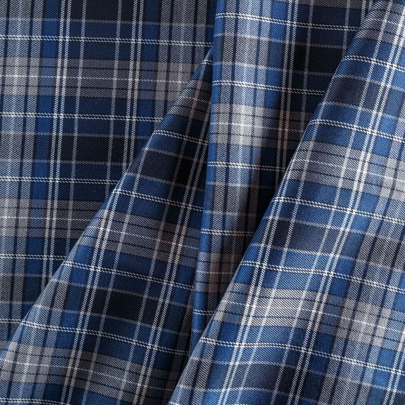 Костюмно-плательная ткань средней плотности в серо-синей гамме. Сочетание линий синего, черного, молочного и серого цветов образуют красивую сложную клетку. Ткань не сухая, пластичная, приятная на ощупь, тянется за счет эластана в составе, формоустойчива, хорошо драпируется. Отлично подойдет для пошива костюмов, юбки, брюк, платья, жакета, сарафана, шорт.