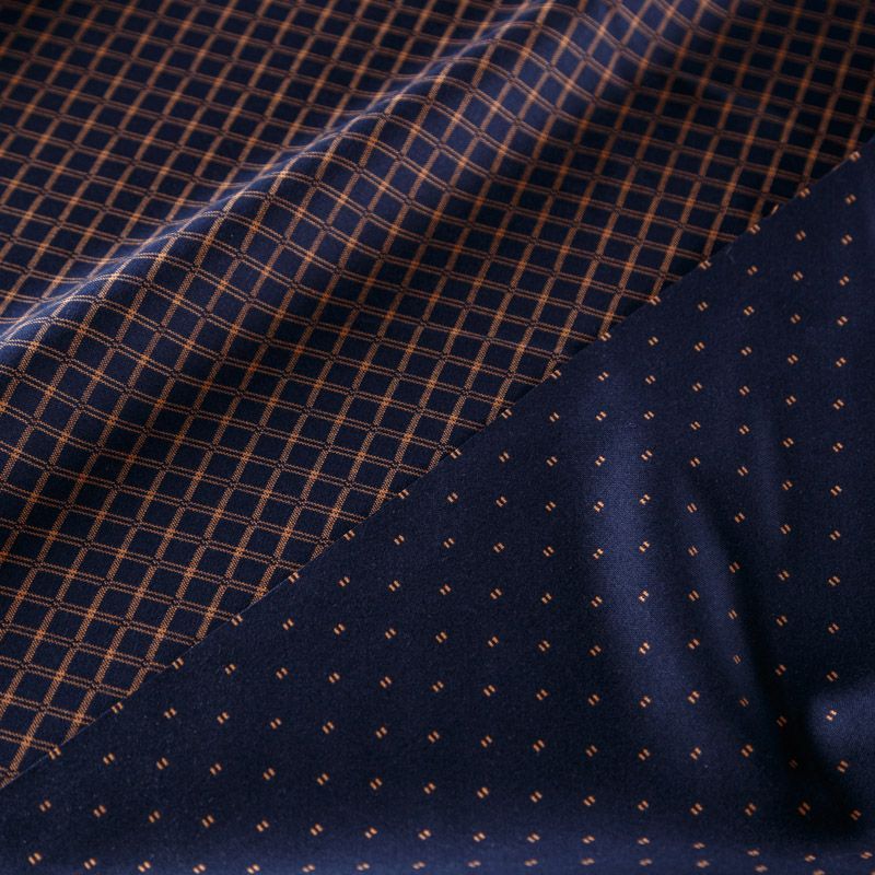 Оригинальная двухсторонняя ткань с принтом клетка с одной стороны и мелким геометрическим рисунком в виде оранжевых точек - с другой. Материал плотный, но не толстый, хорошо драпируется, имеет мягкую поверхность с небольшими ворсинками. Прекрасно подходит для пошива платьев, сарафанов, юбок, брюк, жакетов.