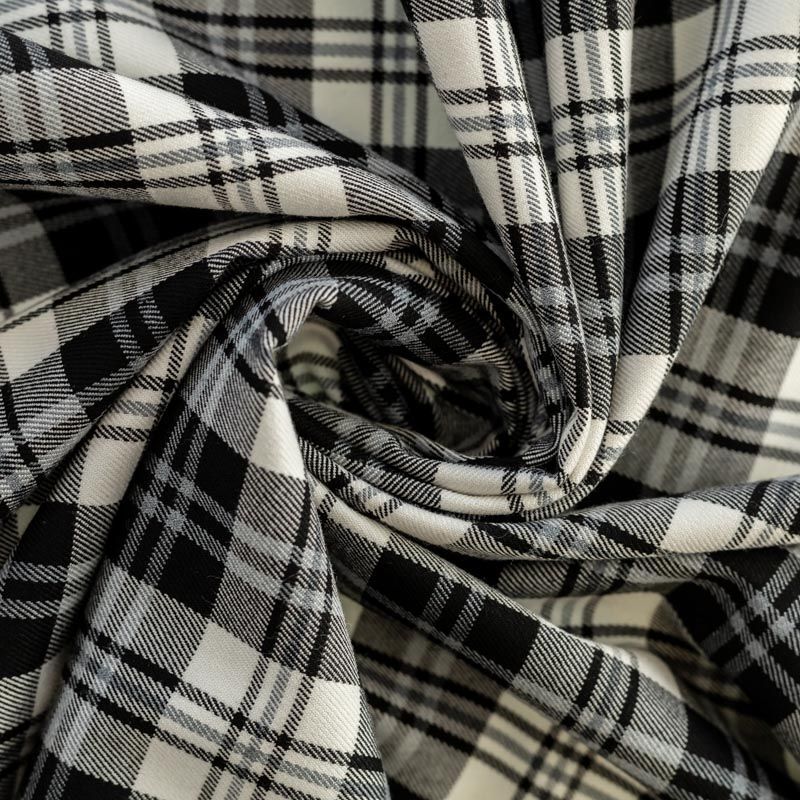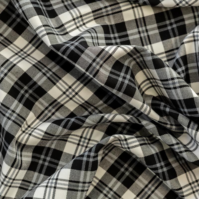 Ткань средней плотности, мягкая и приятная на ощупь, немного тянется, формоустойчива, хорошо драпируется и образует мягкие складки. Сочетание линий серого и черного цветов на белом фоне образует красивую клетку тартан. Ткань отлично подойдет на костюмы, юбки, брюки, платья, жакеты.