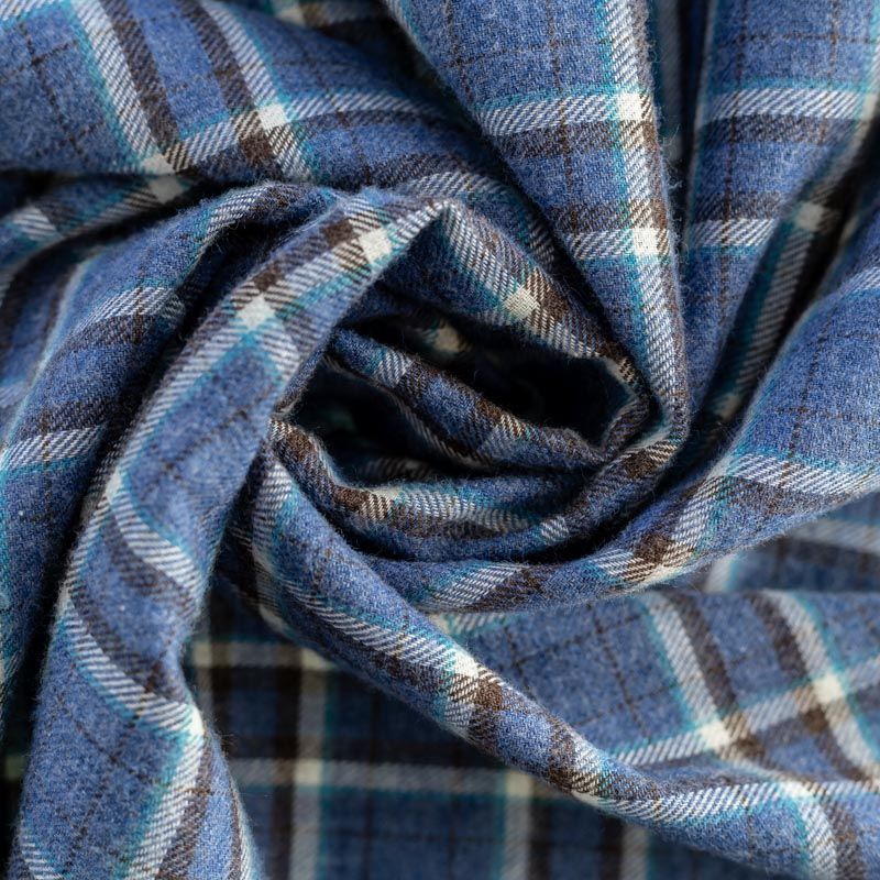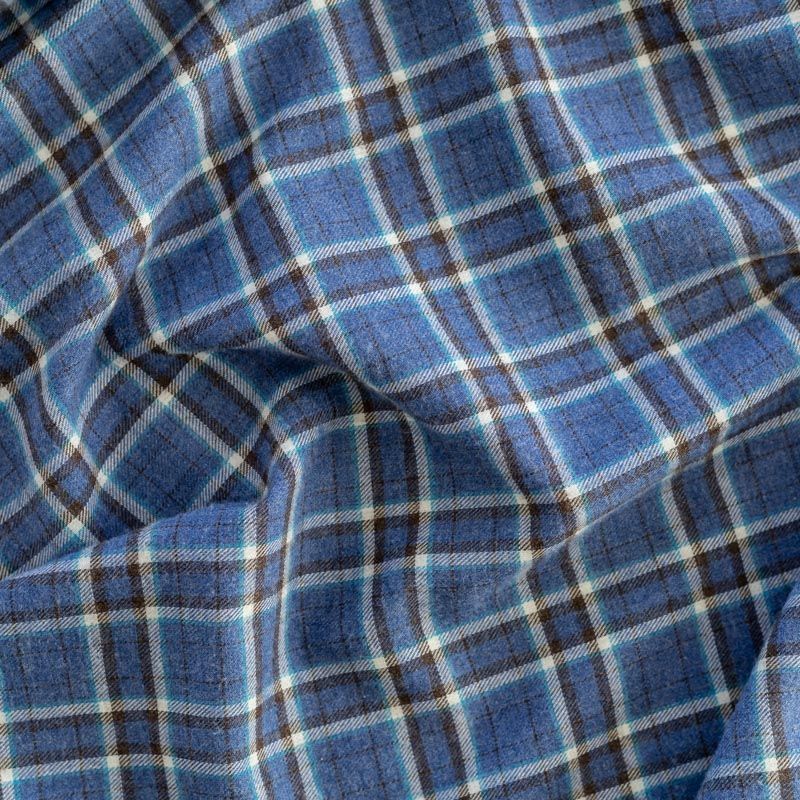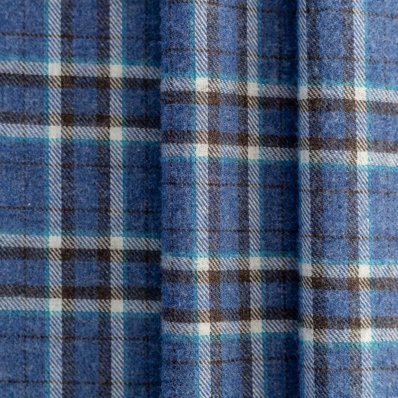 Ткань средней плотности, мягкая и приятная на ощупь, немного тянется, формоустойчива, хорошо драпируется и образует мягкие складки. Сочетание линий черного, ярко-голубого и белого цветов образует сложную красивую клетку. Ткань отлично подойдет на костюмы, юбки, брюки, платья, жакеты, для школьной формы.