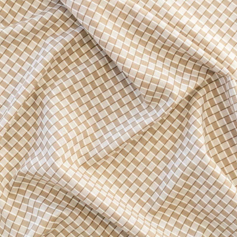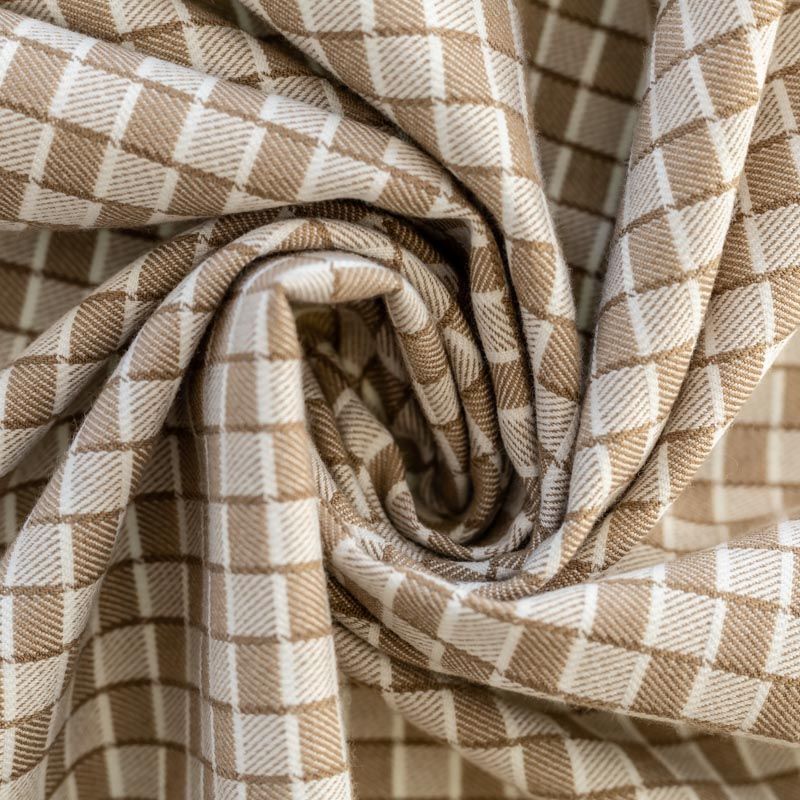 Плотная костюмно-плательная ткань, немного суховатая, но приятная на ощупь, тянется за счет эластана, формоустойчива, не мнется, хорошо драпируется. Мелкая клетка образована за счет расположенных в шахматном порядке квадратиков бежевого и молочного цветов. Ткань отлично подойдет на костюмы, юбки, брюки, платья, жакеты, кардиганы.