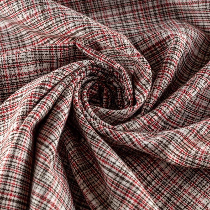 Сочетание линий черного и красного цветов образует сложную мелкую клеточку. Подойдет для пошива платьев, костюма, юбки, жакета любого фасона.