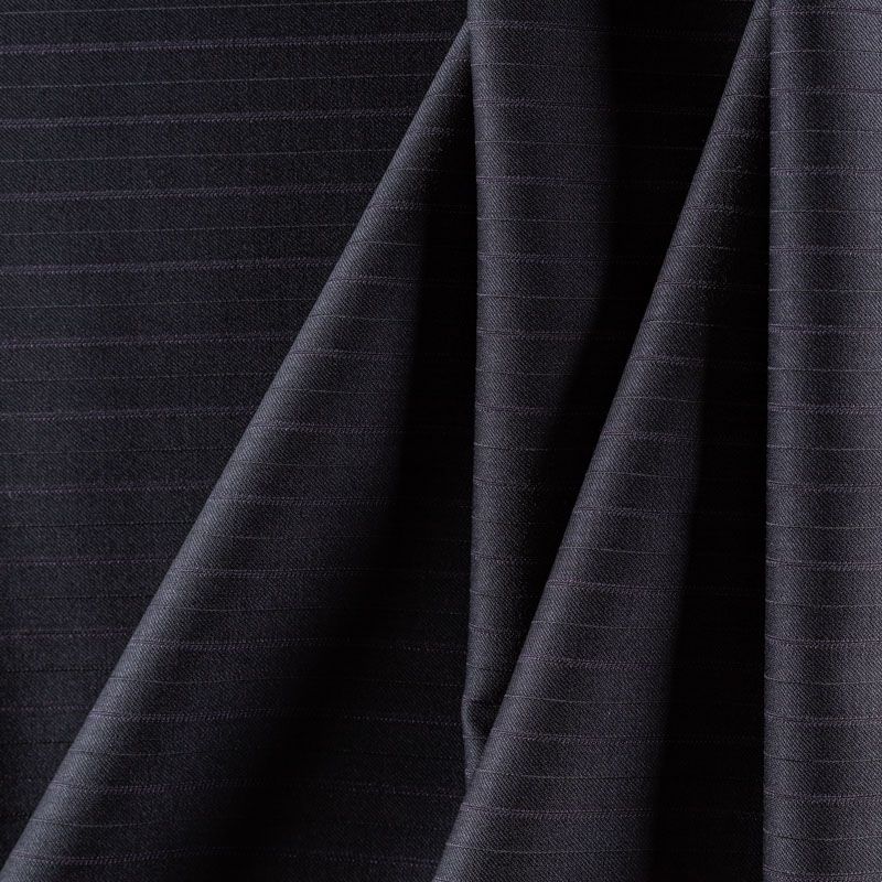 Костюмно-плательная ткань средней плотности, немного суховата, приятная на ощупь. На графитовом фоне очень тонкая полоска сиреневого оттенка, направление - вдоль кромки. Прекрасно подойдет для пошива брюк-палацио, жакета, платья по фигуре, сарафана, классического мужского или женского костюма.