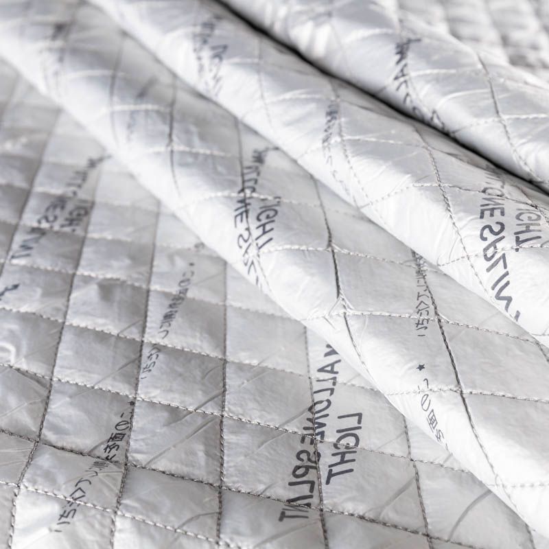 Двухслойная курточная ткань серебристо-серого оттенка с легким эффектом перламутра, простеганная не крупными ромбами размером 3х3 см. Нижний слой - синтепон, верхний - полиэстер, по качеству напоминает болонь. Очень мягкая и легкая, пластичная, хорошо драпируется. Прекрасно подойдет для  пошива легких пальто, курток, жилетов, накидок-кейпов, объемных сумок.