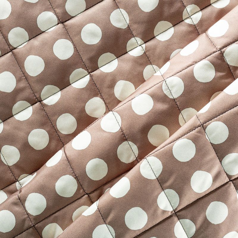 Трехслойная итальянская курточная ткань теплого серого оттенка в белый горох, простеганная не крупными ромбами размером 3х3 см. Нижний слой черного цвета, заменяет подклад, средний слой - синтепон, верхний слой - матовый полиэстер, напоминающий болонь. Ткань легкая, пластичная, хорошо драпируется. Прекрасно подойдет для пошива легких пальто, курток, бомберов, жилетов, накидок-кейпов, объемных сумок, одежды для домашних питомцев, туристического снаряжения.