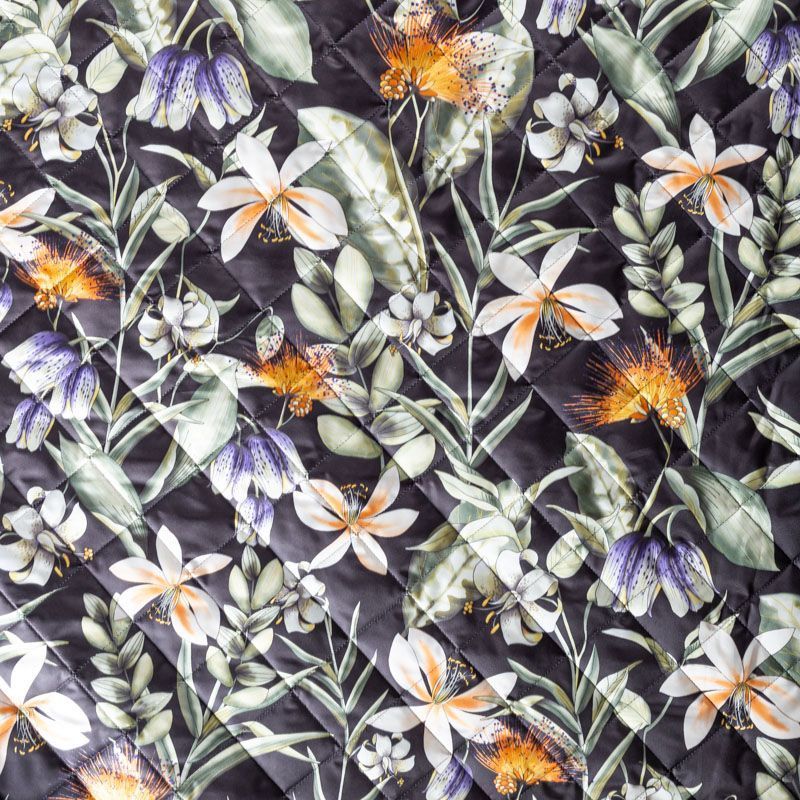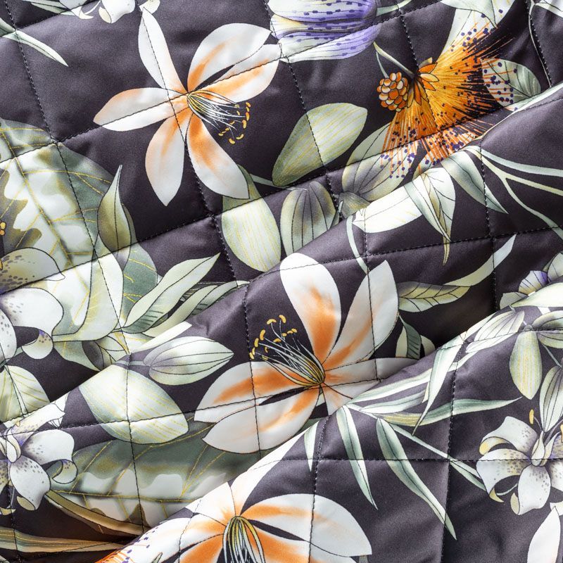 Трехслойная итальянская курточная ткань черного цвета с ярким цветочным принтом, простеганная не крупными ромбами размером 3х3 см. Нижний слой черного цвета, заменяет подклад, средний слой - синтепон, верхний слой - красочный матовый полиэстер, напоминающий болонь. Ткань легкая, пластичная, хорошо драпируется. Прекрасно подойдет для  пошива легких пальто, курток, бомберов, жилетов, накидок-кейпов, объемных сумок, одежды для домашних питомцев, туристического снаряжения.