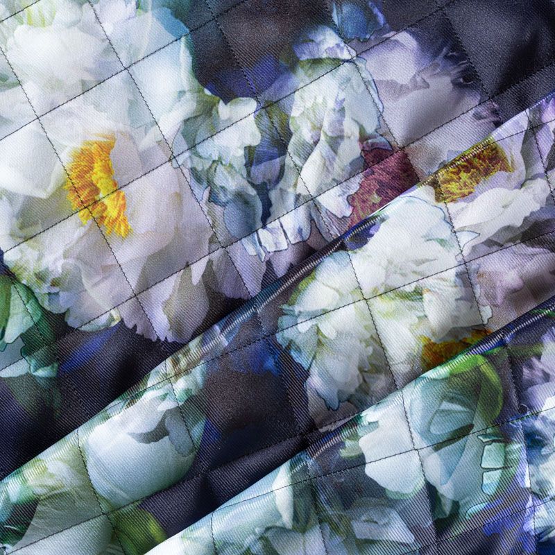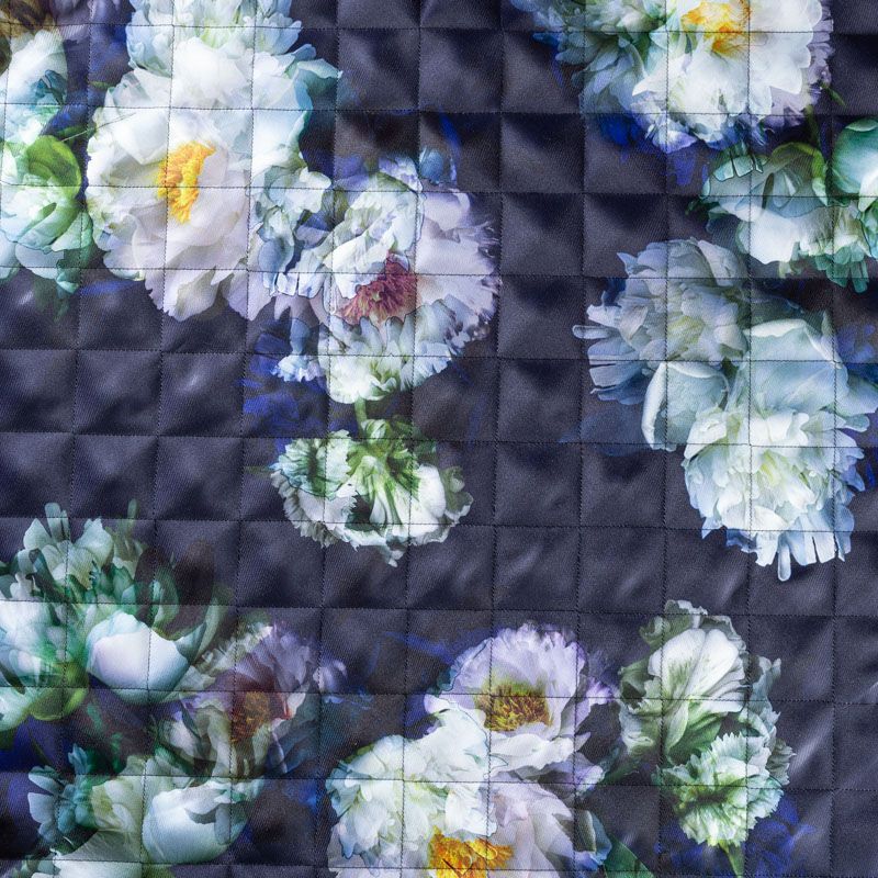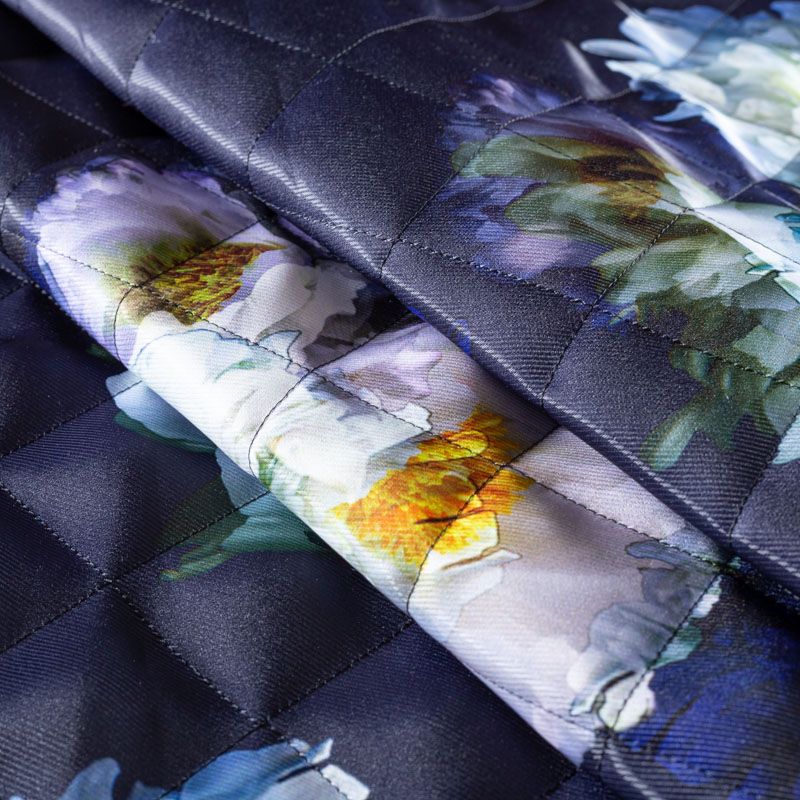Трехслойная итальянская курточная ткань темно-синего оттенка с акварельным цветочным принтом, простеганная не крупными ромбами размером 3х3 см. Нижний слой черного цвета, заменяет подклад, средний слой - синтепон, верхний слой - красочный полиэстер твилового плетения с легким блеском. Ткань легкая, пластичная, хорошо драпируется. Прекрасно подойдет для  пошива легких пальто, курток, бомберов, жилетов, накидок-кейпов, объемных сумок, одежды для домашних питомцев, туристического снаряжения.